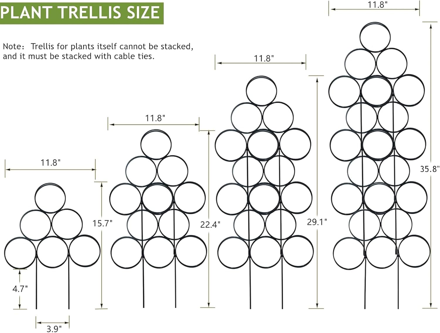 - 🌱Stackable with Cable Ties: Please note: Ties must be used to stack. Take out a plant trellis and insert the two legs into the two circles on the second layer of the other climbing trellis, and then fix the first row of overlapping circles with two ties. Please refer to the pictures for details. Stack up to 2 layers (height: 22.4in) , 3 layers (height: 29.1in) or 4 layers (height: 35.8in) as needed, or you can use it alone as decorations on potted plants.