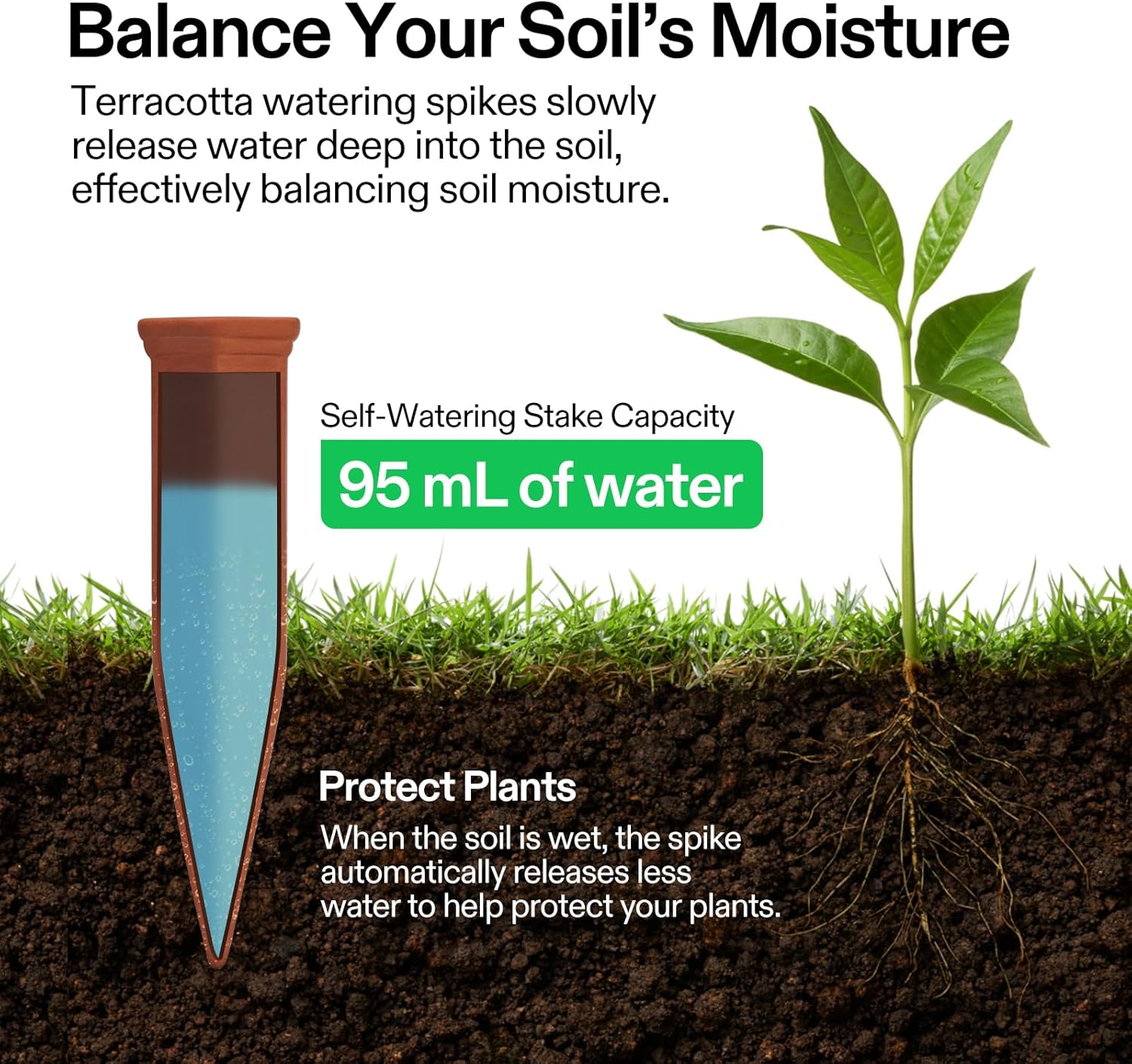- Balance Your Soil’s Moisture: Terracotta watering spikes slowly release water deep into soil, effectively improving soil moisture; When the soil is wet the spike releases less water automatically, protecting your plants