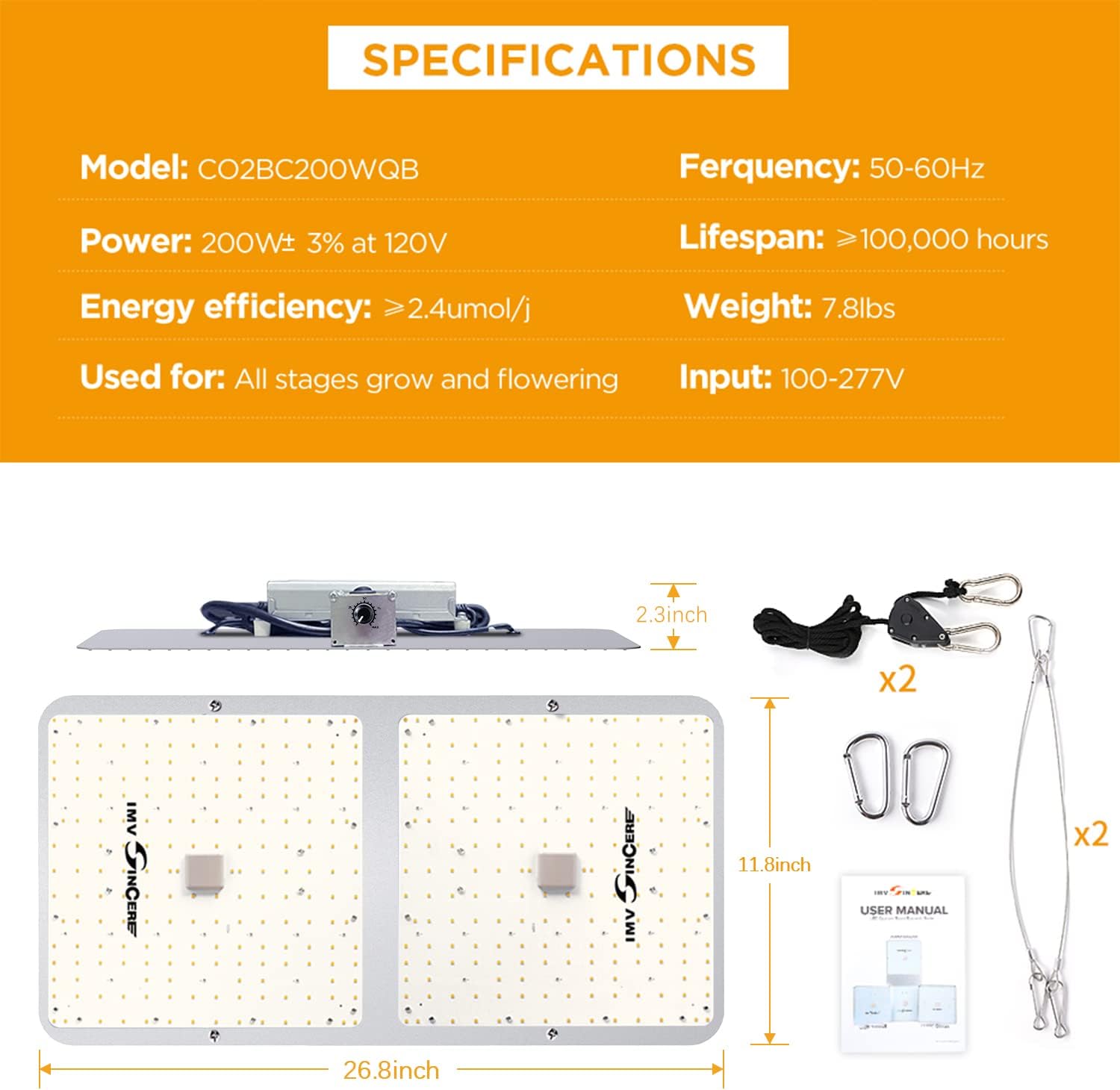 IMVSINCERE LED Grow Lights, BC200W Full-Spectrum LED Grow Light with Samsung Diodes Dimmable