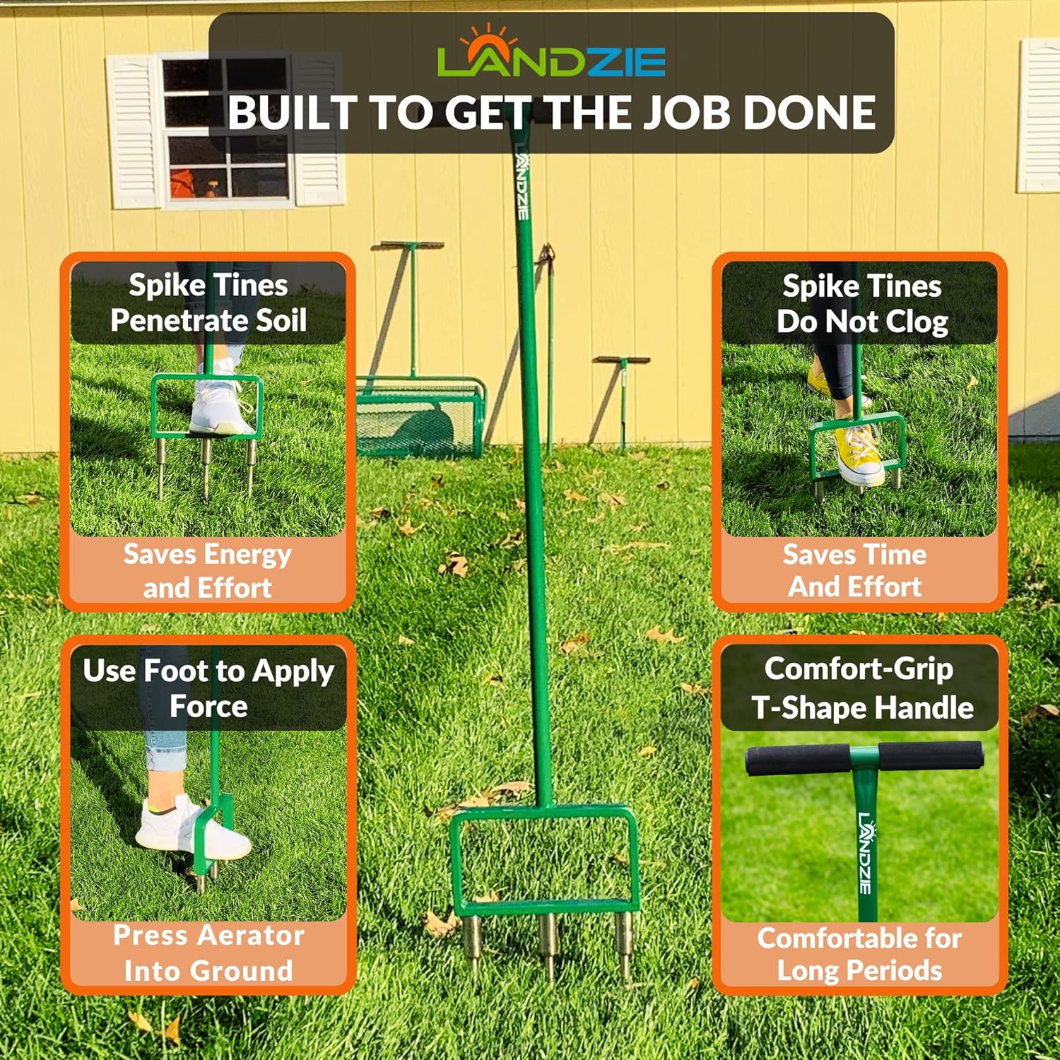 - HAVE THE LAWN OF YOUR DREAMS: Revitalize your lawn this season by using the Landzie Fork Lawn Plug Aerator to remove compacted soil and thatch and promote healthy grass growth throughout. Aerator coring your lawn encourages healthy root growth, enhances resistance to drought and flooding, and reduces the need for excessive amounts of fertilizer. USE your Landzie Soil Aerator with the Landzie Spreader (B07ZQSV81S) and the Landzie Lawn Level (B095KSKXPQ) for a lush and level lawn this season.