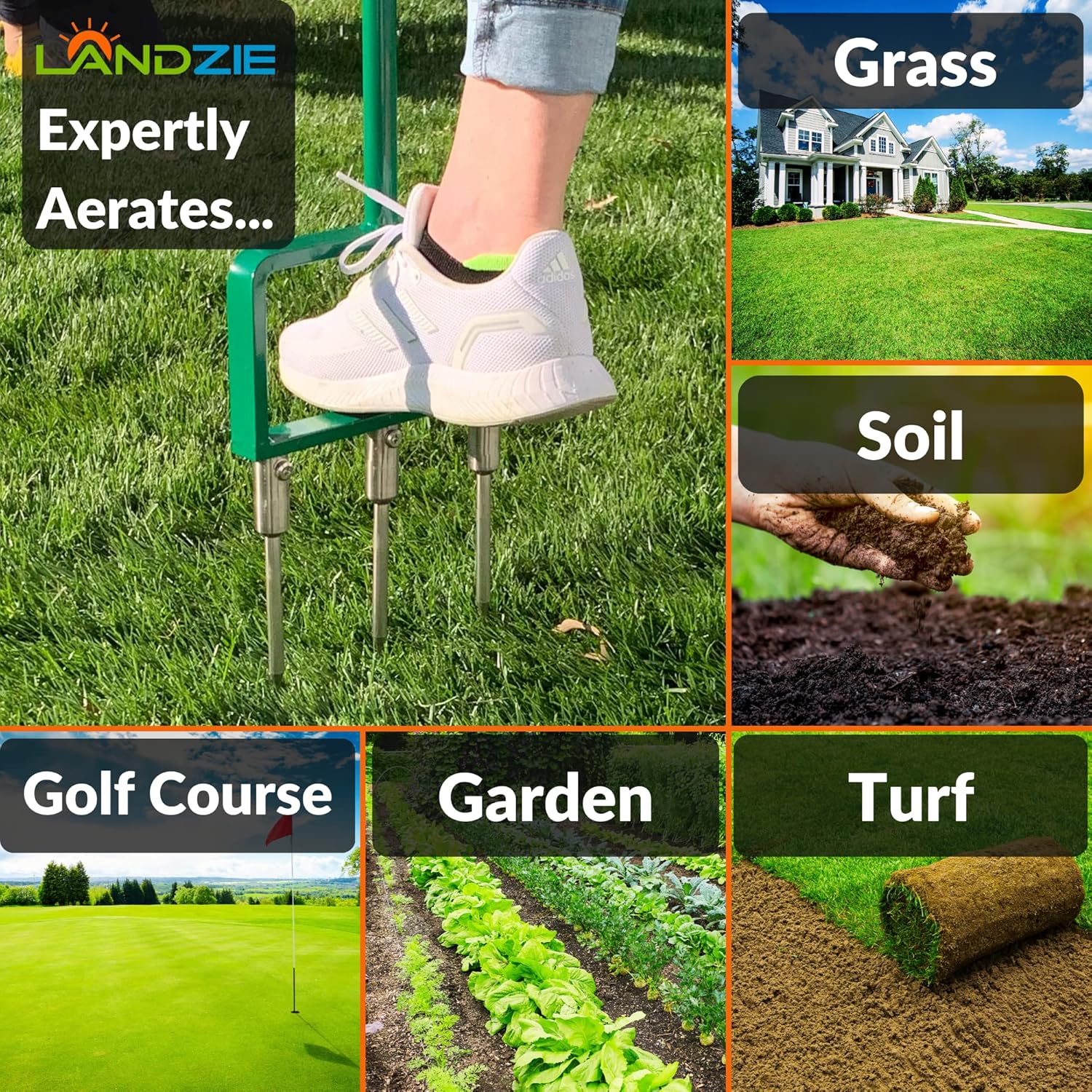- HAVE THE LAWN OF YOUR DREAMS: Revitalize your lawn this season by using the Landzie Fork Lawn Plug Aerator to remove compacted soil and thatch and promote healthy grass growth throughout. Aerator coring your lawn encourages healthy root growth, enhances resistance to drought and flooding, and reduces the need for excessive amounts of fertilizer. USE your Landzie Soil Aerator with the Landzie Spreader (B07ZQSV81S) and the Landzie Lawn Level (B095KSKXPQ) for a lush and level lawn this season.
