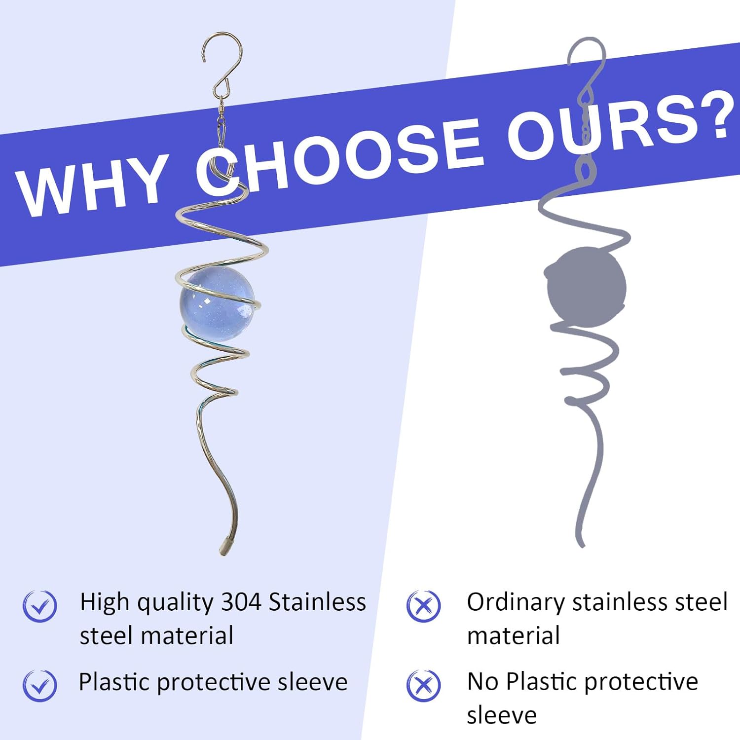 - 【HIGH QUALITY】:11inch height spiral tail made of #304 stainless steel wire,the 2inch colored ball made of pure solid color glass material,have good weather resistant,no fading under sunshine. Better quality than iron material with nickle plating and painting color glass ball in the market.