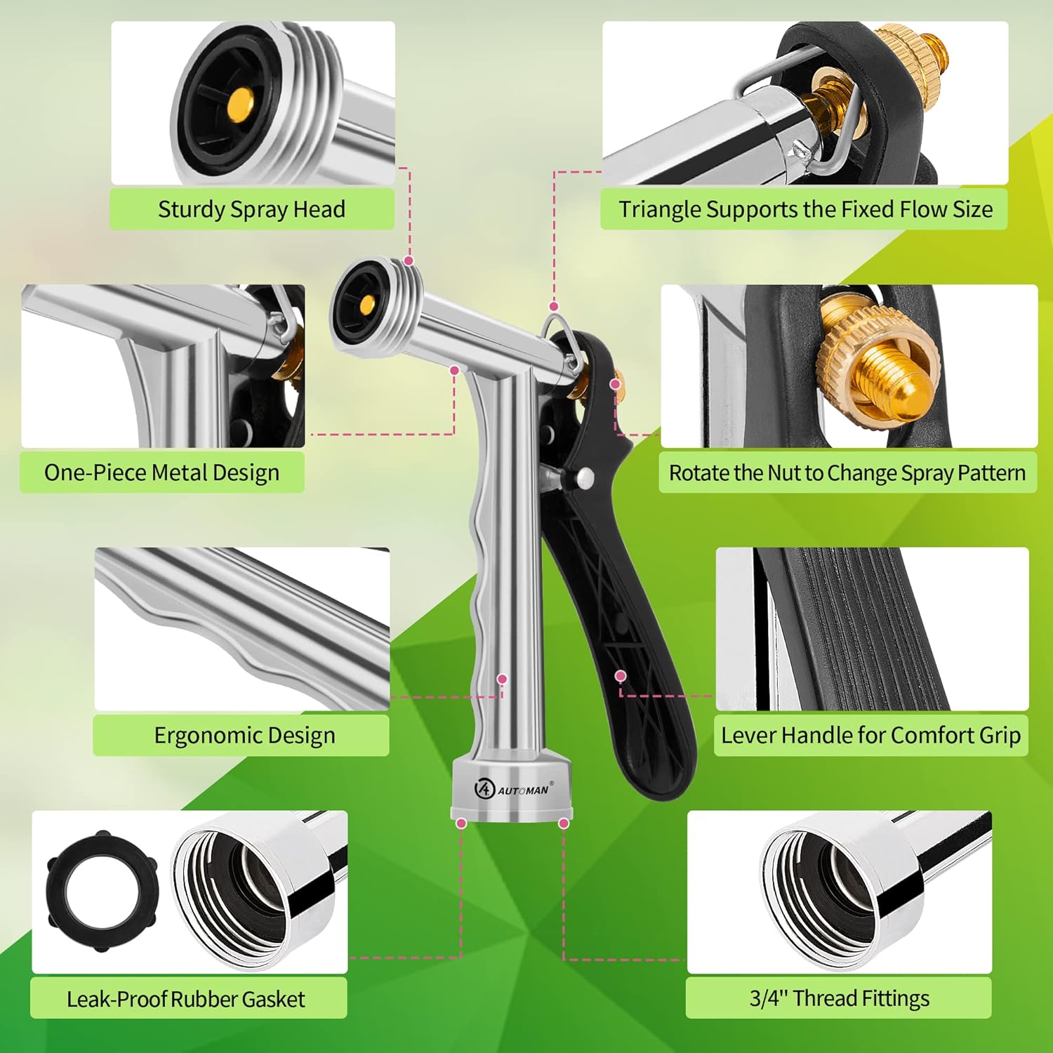 - ADJUSTABLE HIGH PRESSURE NOZZLE: AUTOMAN hose nozzles will meet your watering needs. If youโd like to adjust the water flow, you only need to press the handle to get flexible or adjustable water flow from fine mist, moderate cone spray and high pressure jet stream. Easy to use and a powerful nozzle you will get and love.