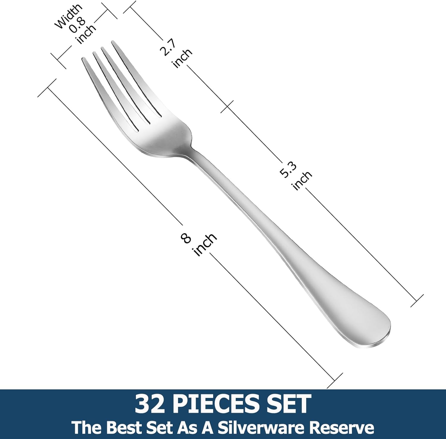 32-Piece Dinner Fork Set, Stainless Steel Silverware, Cutlery, Mirror Polished, Dishwasher Safe - 8 Inch