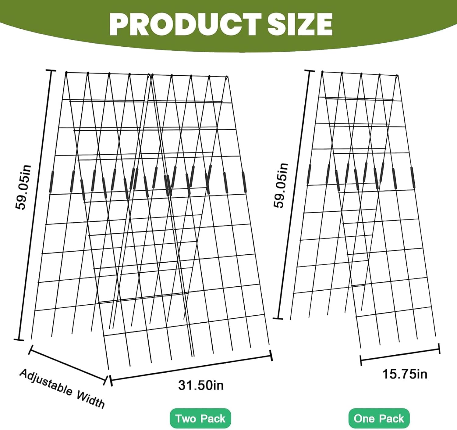 - 【EXTENDED DESIGN】The cucumber trellis is 59”H x 15.7”W. The extended trellis is more suitable for climbing plants or vegetables. if you put 2 packs together, it measures 31.5"W x 59"H. The perfect size metal garden trellis is perfect for cucumbers, squash, peas and flowering vines.