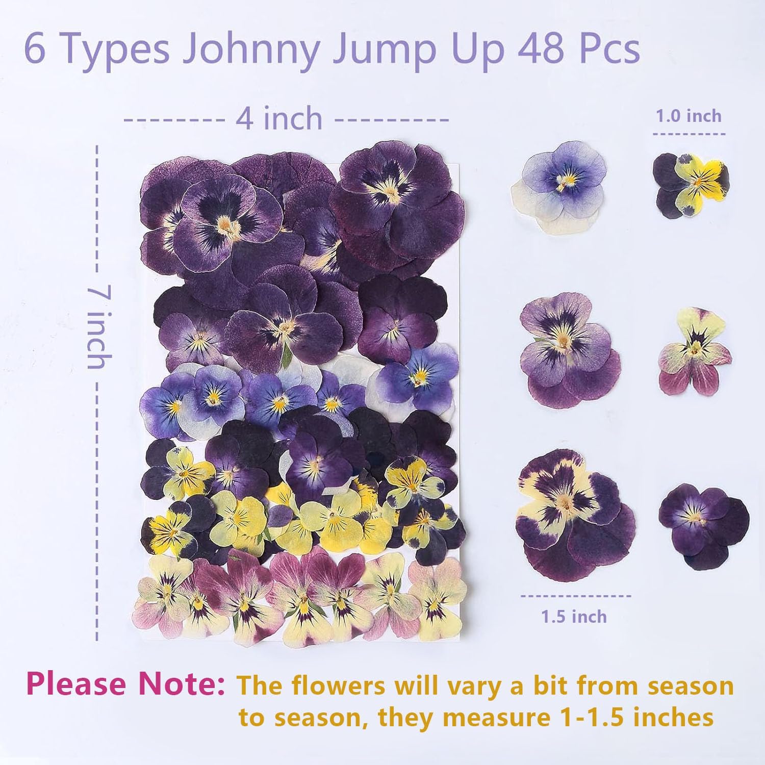 - Pressed flowers made of natural Johnny Jump Up, thus each piece varies slightly in size and shape.Each package contains 6 types of violets. total about 48 pcs