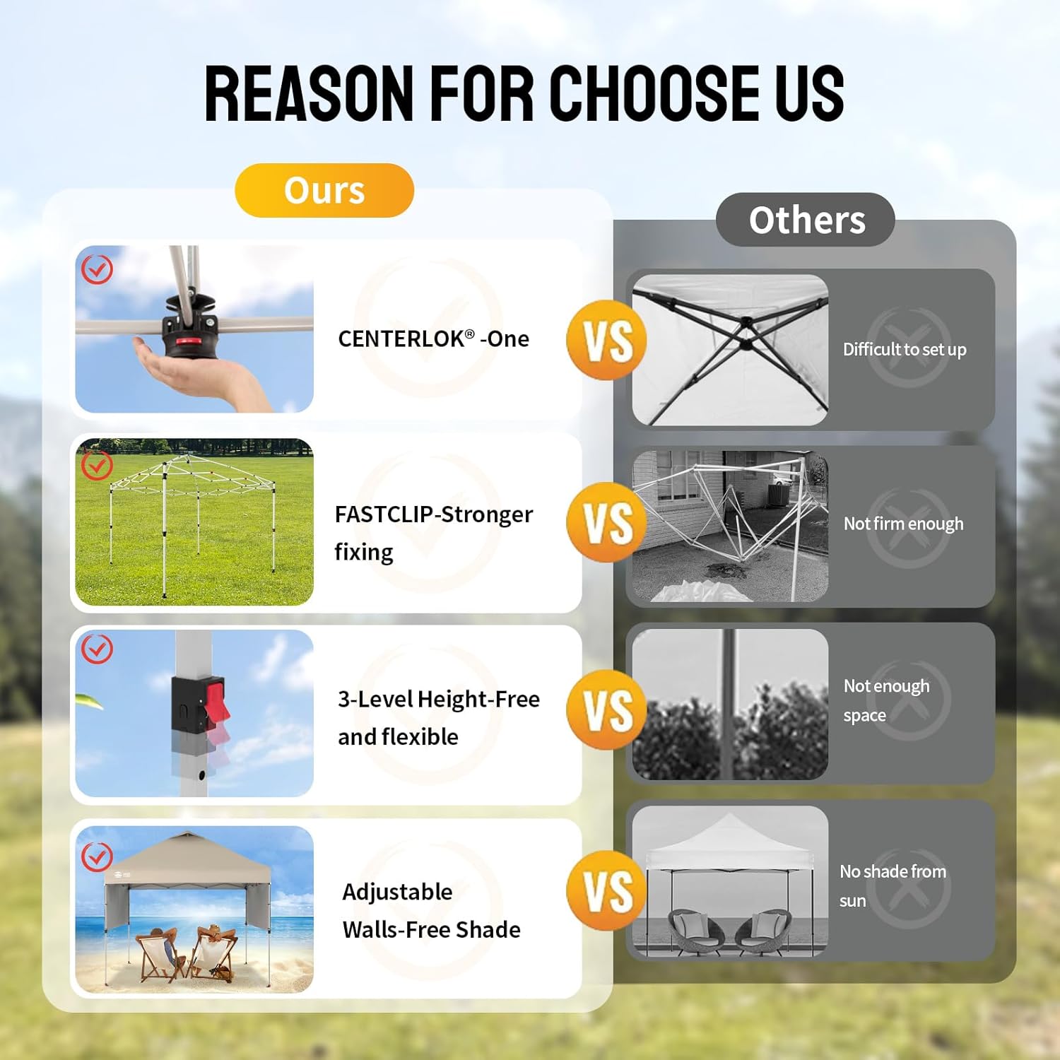 - [EASIEST SET UP]: Patented one push center lock technology – central hub locks out all four legs with a single push. Then use the soft pinch-free buttons to set the leg height. Next generation canopy designed so two people can set it up in seconds with no tools necessary.