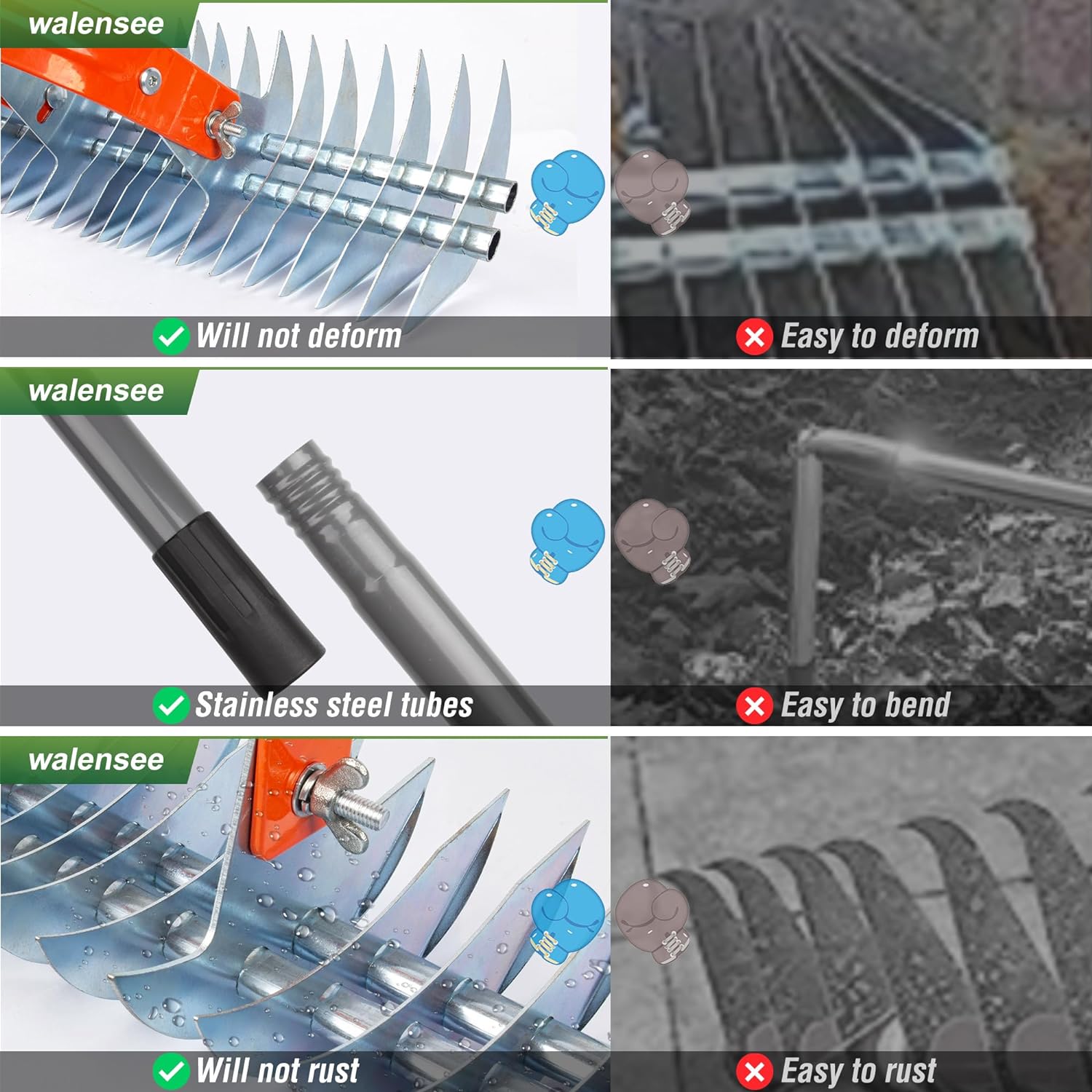 - Durable Construction: The Walensee thatch rake is made from high-quality durable stainless steel, offering reliability and longevity. Treated with anti-rust and anti-corrosion coatings, this thatch rake is sturdy enough to resist deformation or breakage and its length can be adjusted according to your needs. The pole of the rake head has a plastic lining, adding to its robustness. The tail of the pole is fitted with a rubber anti-slip sleeve, providing you with the comfortable experience.