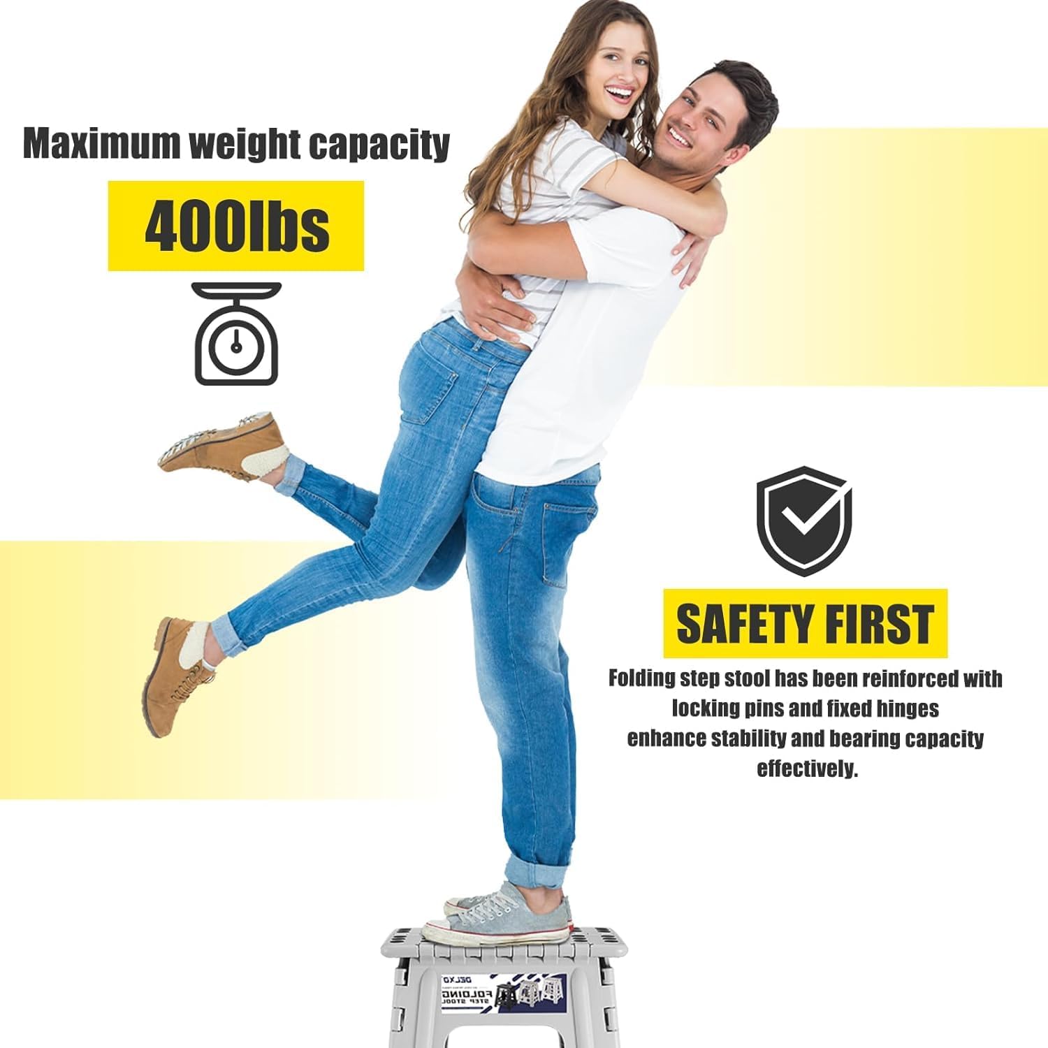 - Safe Upgrade Step Stool : Features improved the folding bar, it has been reinforced with locking pins and fixed hinges which can prevent from collapse inward while Steping on it.Delxo have designed a safety stop gap feature that allows the foldable stool to prevent being squashed, great for adults. Four round corner super safe protect your body from clashing. All of this design is put your safe first