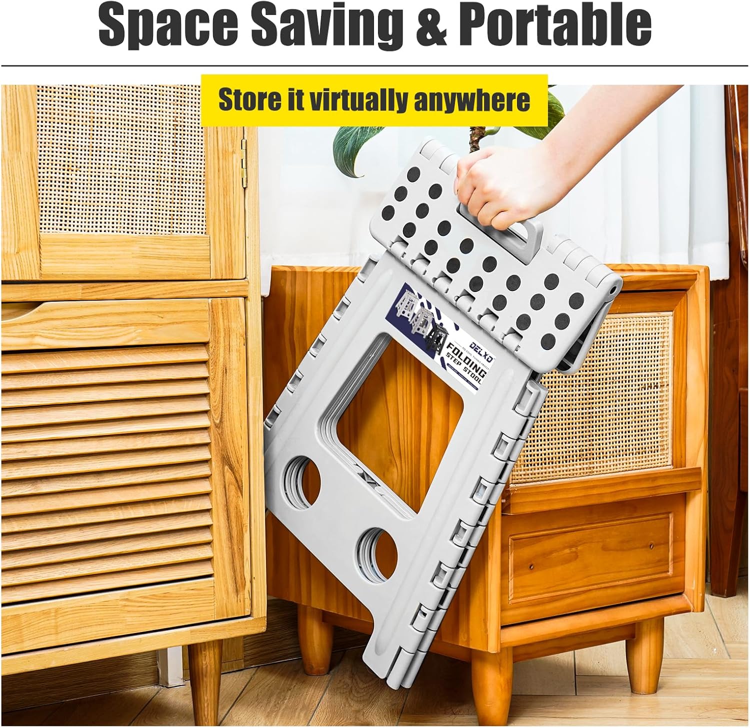 - Space Saving Foldable Stool : Delxo step stool save your closet space more than 90% when it folded up.It's quickly and easily folds away for convenient storage so you can opens with one flip of the hand.Also you can hides them in corner at home because it's so compact. Great folding stool for in the kitchen, bathroom, dining room, office, garden, camping, fishing and more.Carry this quick-fold step stool wherever you go