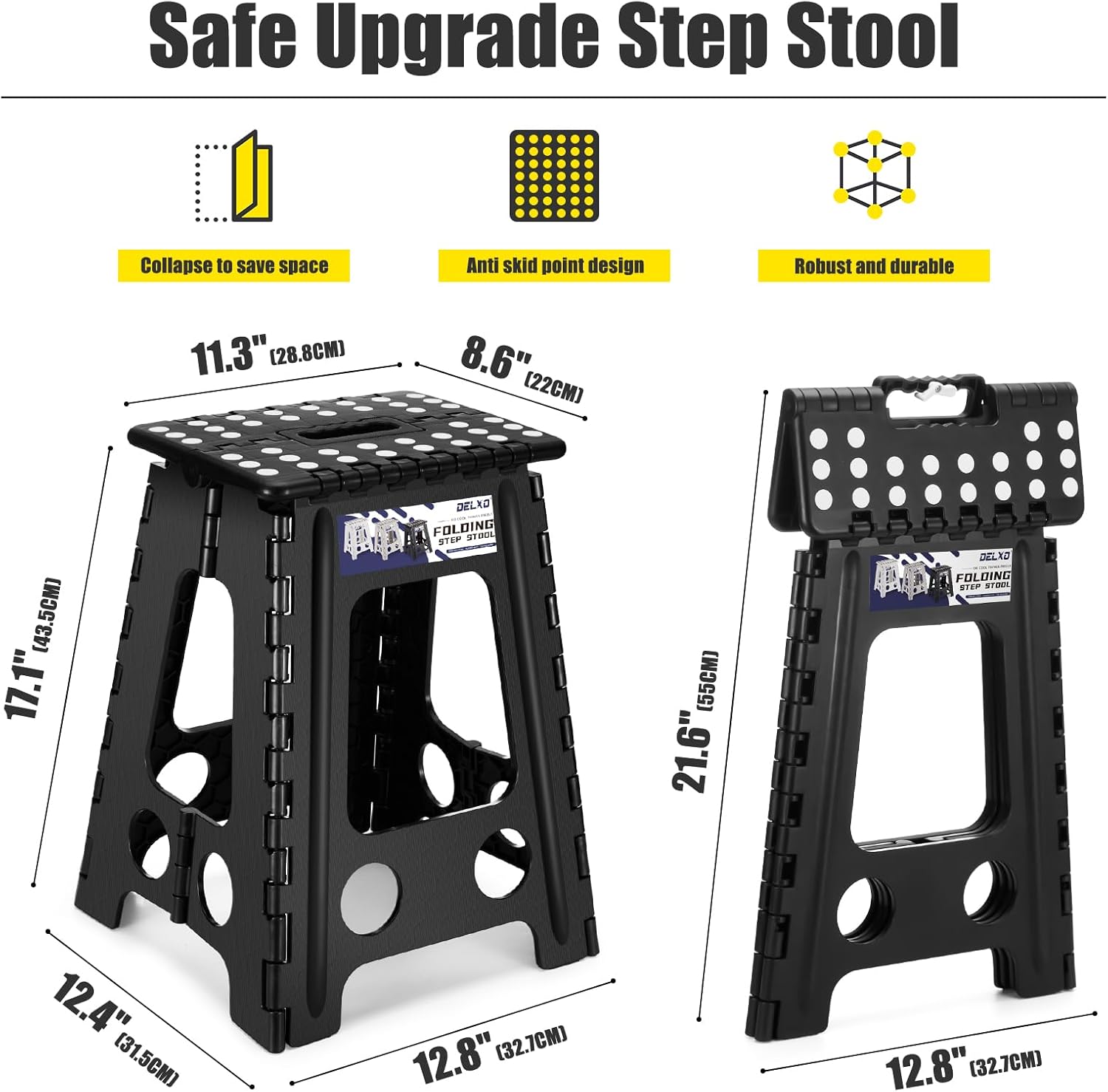 Delxo 17.5 Inch Folding Step Stool,Foldable Stool for Adults with Safety Lock,Portable Collapsible Plastic Step Stool,Non Slip Folding Stools for Kitchen Bathroom Bedroom Up to 400LBS,(Black 1PC)