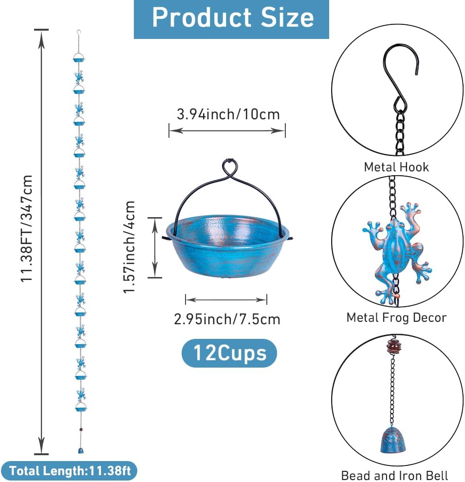 - Stylish Design: The rain catcher chain is blue and golden, consisting of 11 cute frogs and 12 cups. You can enjoy the amazing scene of rain flowing down the rainchains, without worrying about it splashing everywhere, because of the design of the wide cup