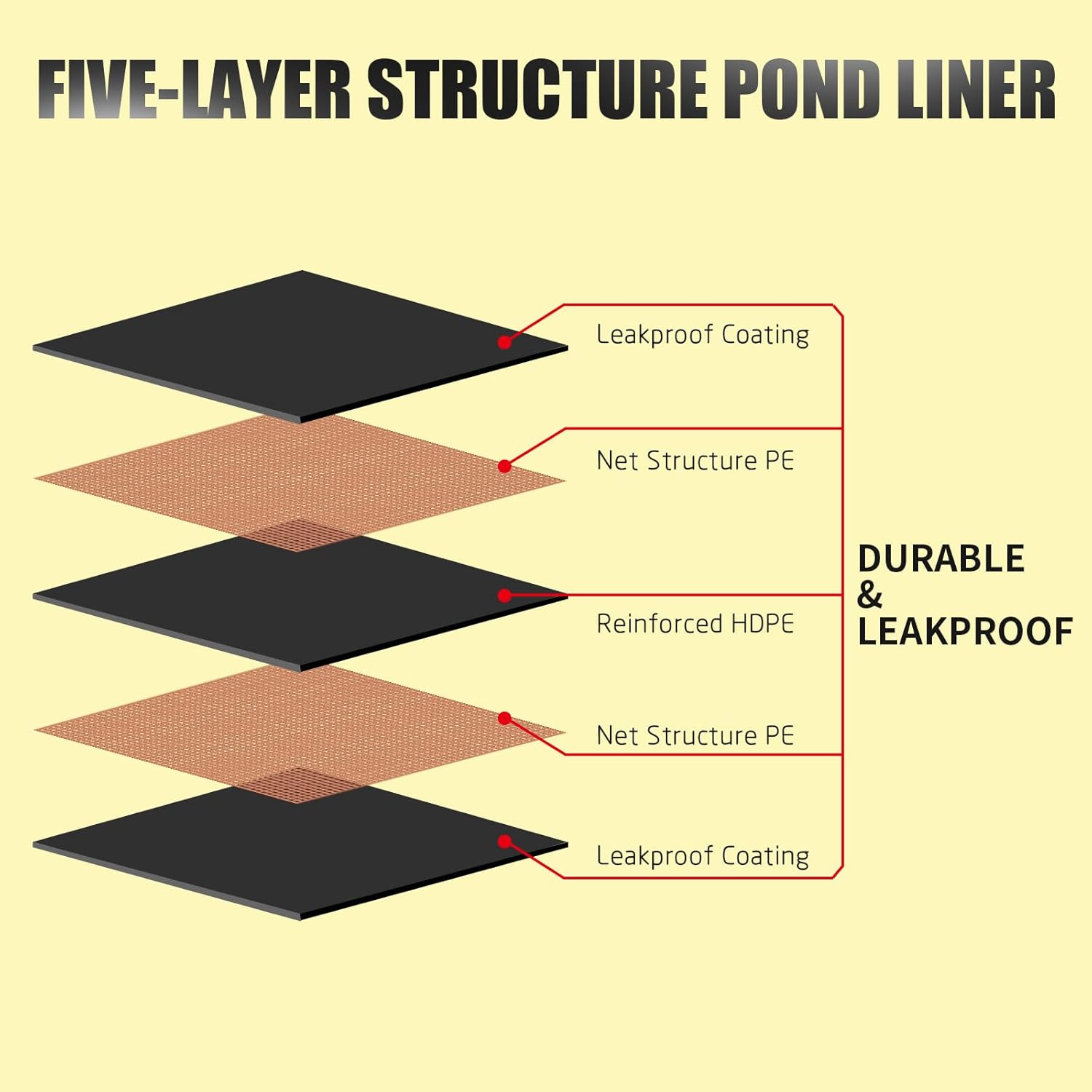 - π[Durable & Leakproof]: The KOI pond liner is with unique five-layer structure design. The middle is reinforced HDPE with net structure PE and leafproof coating on both sides. Itβs more durable and leakproof than most pond liners in the current market.
