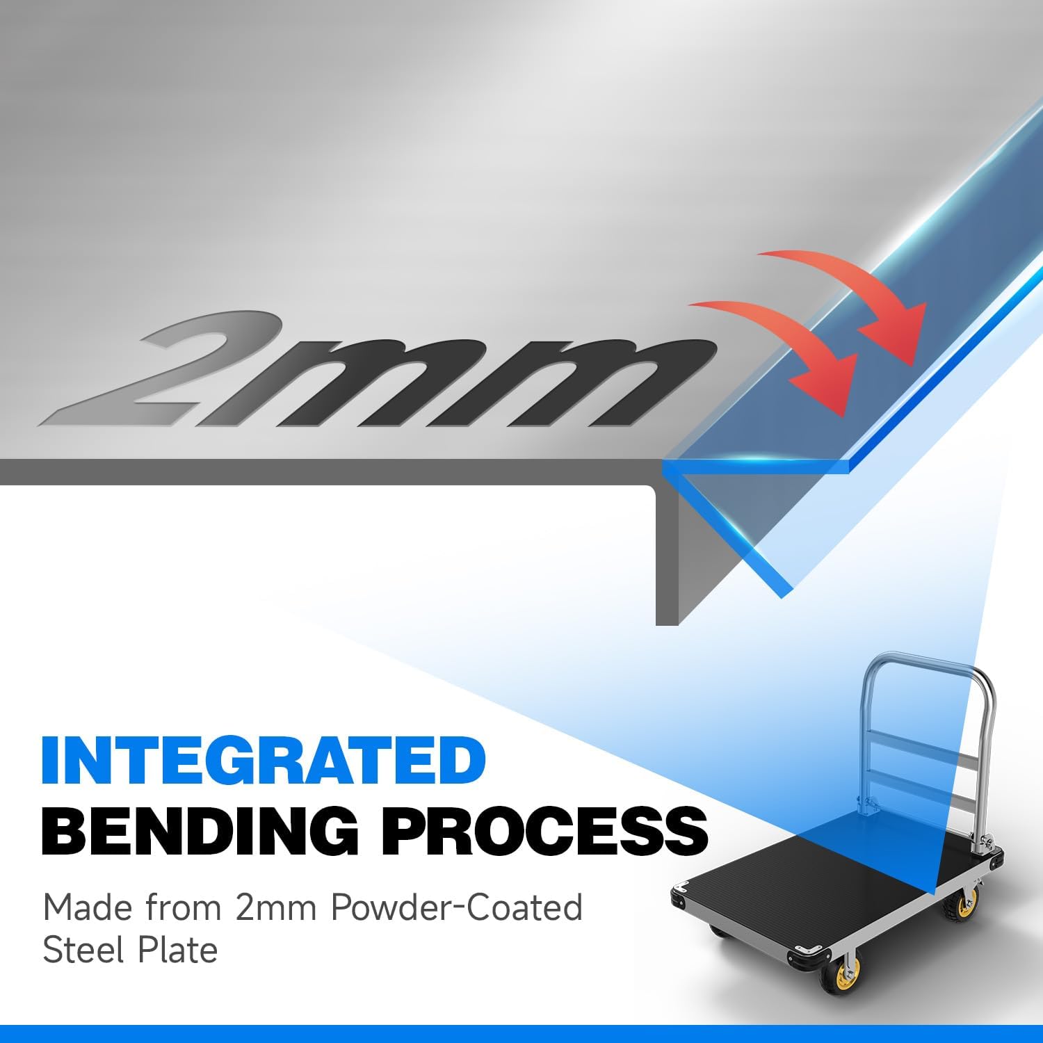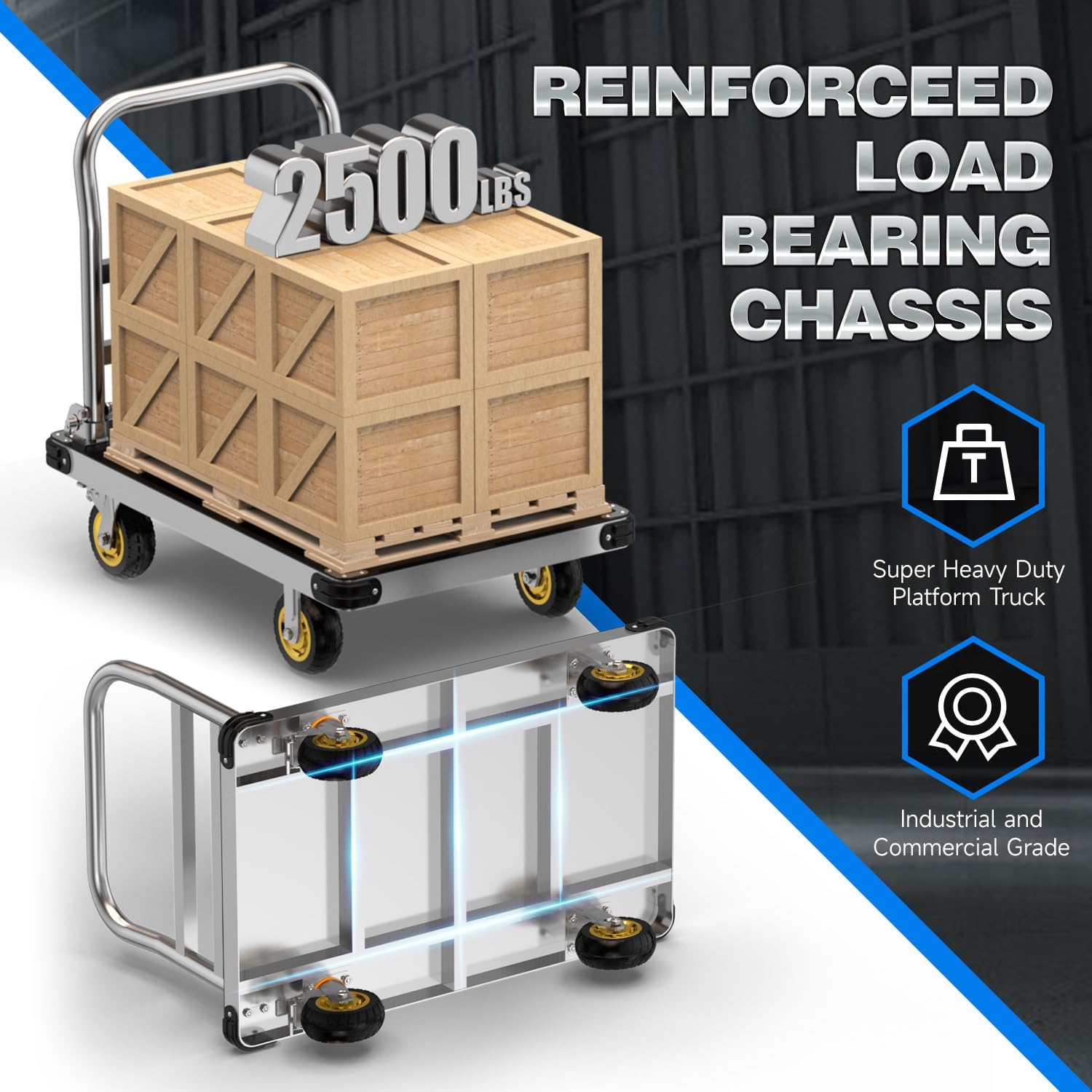 - 2500 LBS Load Capacity: Crafted from robust 2mm thick steel plates, the heavy duty platform truck cart main body employs integral bending for enduring construction that withstands heavy loads and wear. Engineered with a reinforced bottom support, our platform truck ensures even weight distribution, preventing sagging, and reliably carries substantial loads up to 2500 lbs. Count on this cart for dependable performance, whether it's heavy equipment or bulk items.