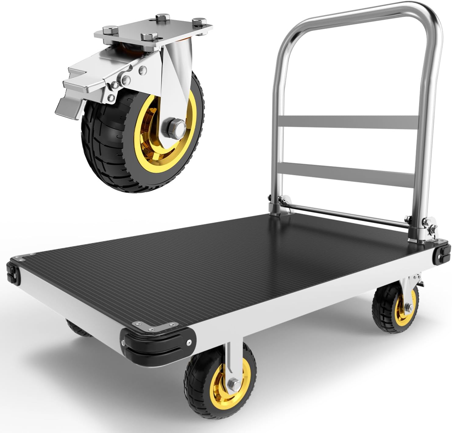 - Silent and Stable: Four secure 6" heavy-duty wheels guarantee seamless and reliable transportation for your materials. The folding heavy duty cart with wheels two rear wheels are engineered with 360-degree swivel functionality for sharp angles and corner maneuvering. The platform cart's rubber wheels minimize noise. Our platform truck features multiple bends along the border and bottom, ensuring superior structural stability.