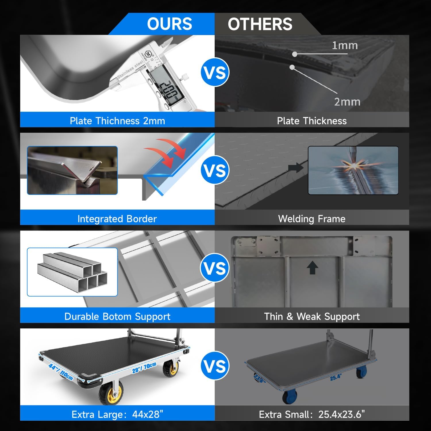 - Extra Large Platform Space: Size: 44 x 28 inches. The folding Flat bed cart generous platform accommodates larger loads. Anti-collision bars have been added to the four corners of the platform dolly to prevent collisions that might affect your feet. The included non-slip mat not only protects the cart's surface but also prevents items from slipping, ensuring a secure transport experience.