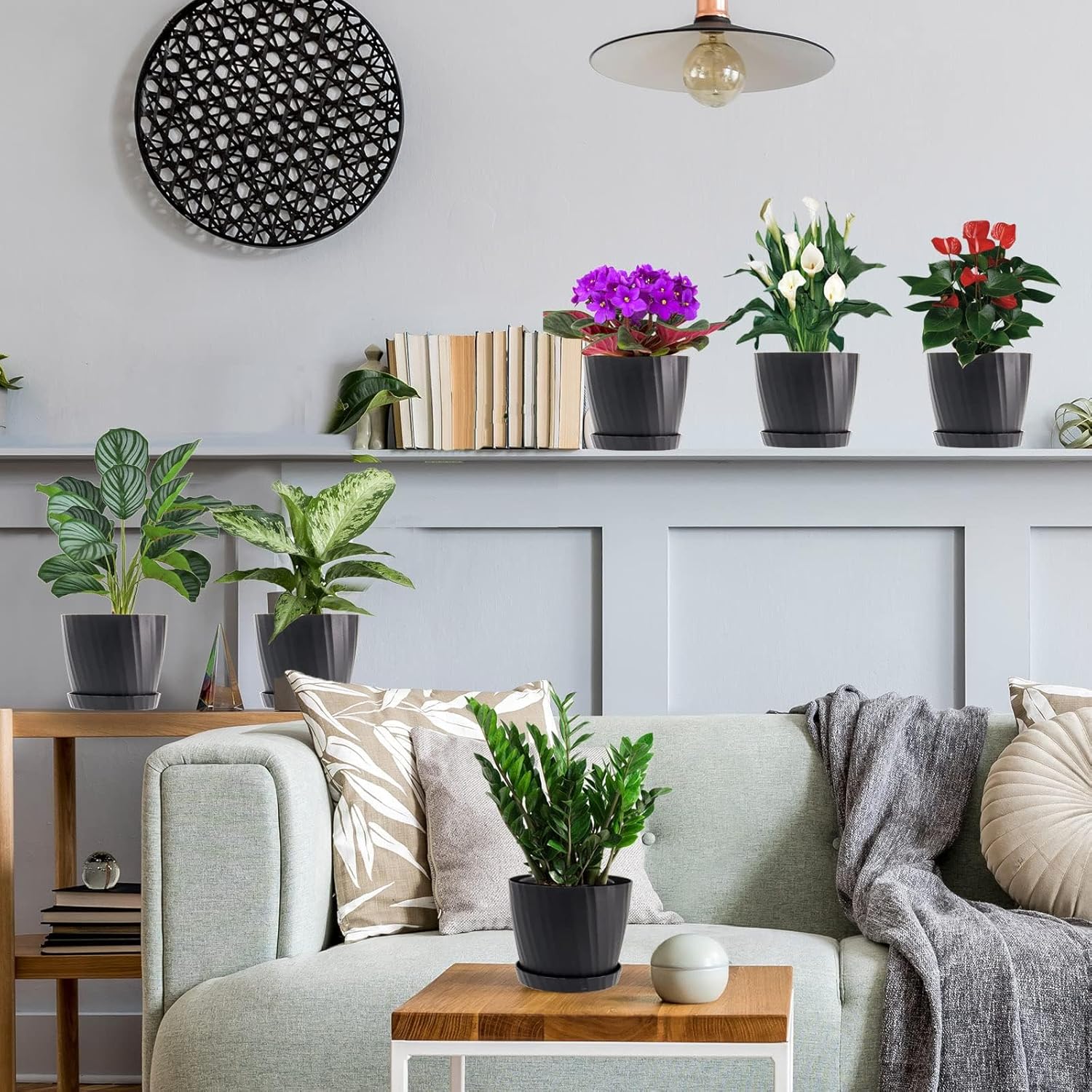 7 Inch Plant Pots Bulk, 6 Pack Plastic Planters with Drainage Holes and Saucers for Indoor Outdoor House Plants and Flowers, Black