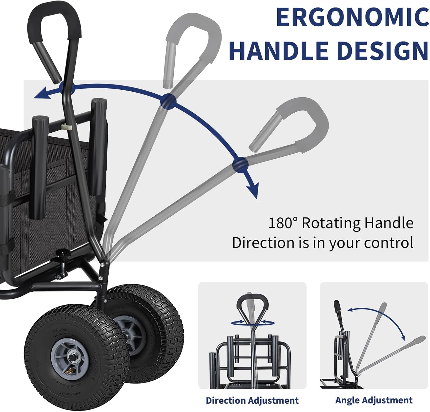 - [All-terrain Off-road Big Wheels] Four 11'' large diameter all-terrain off-road universal inflatable wheels well enhance traction and improve stability, so that push and pull the wagon are very labor-saving and convenient.Enlarged size prevents overwhelming the wheel due to heavy items. The latest upgraded design makes the front wheels rotate as the handle turns, which is more energy-saving and easier to control than the universal wheel.Combined with unique anti-slip pattern can easily transport loads on a variety of terrains such as sand beach, gravel and grass