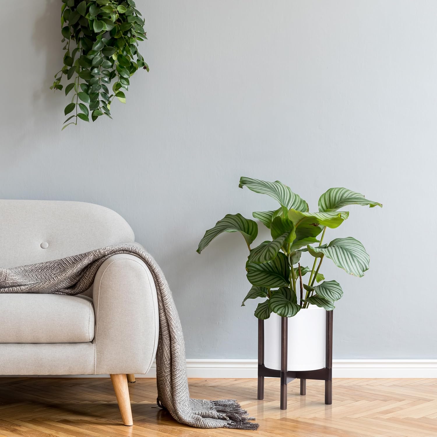 - A Complete Set: Minimalist plastic planter, combined with a sculptural, solid wood stand that match perfectly together and looks great in any home.
