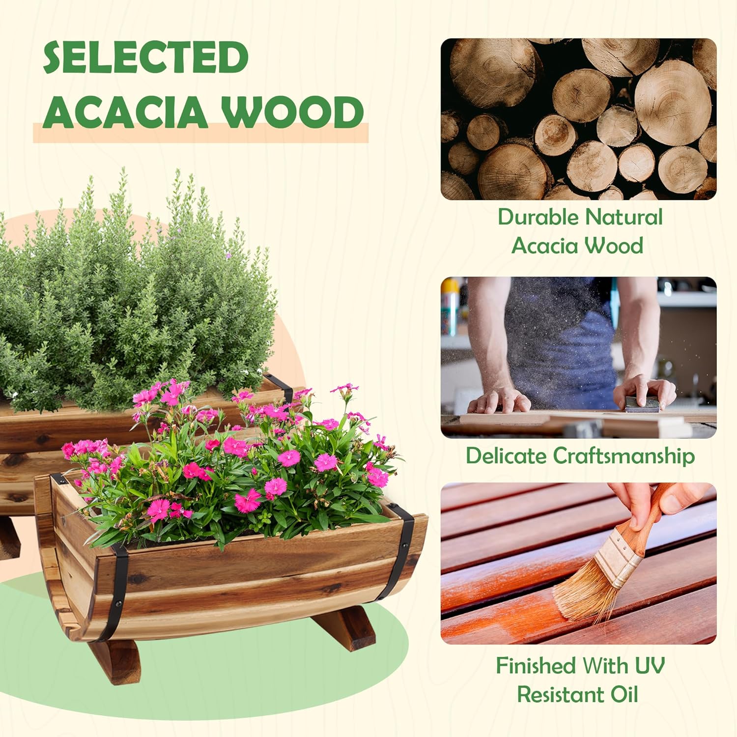 IDZO Solid Acacia Wood Half Barrel Planters Outdoor Set of 2 Different Sizes, Wooden Planters for Outdoor Plants with Metal Bands & Drainage Holes, Legs Included, Natural
