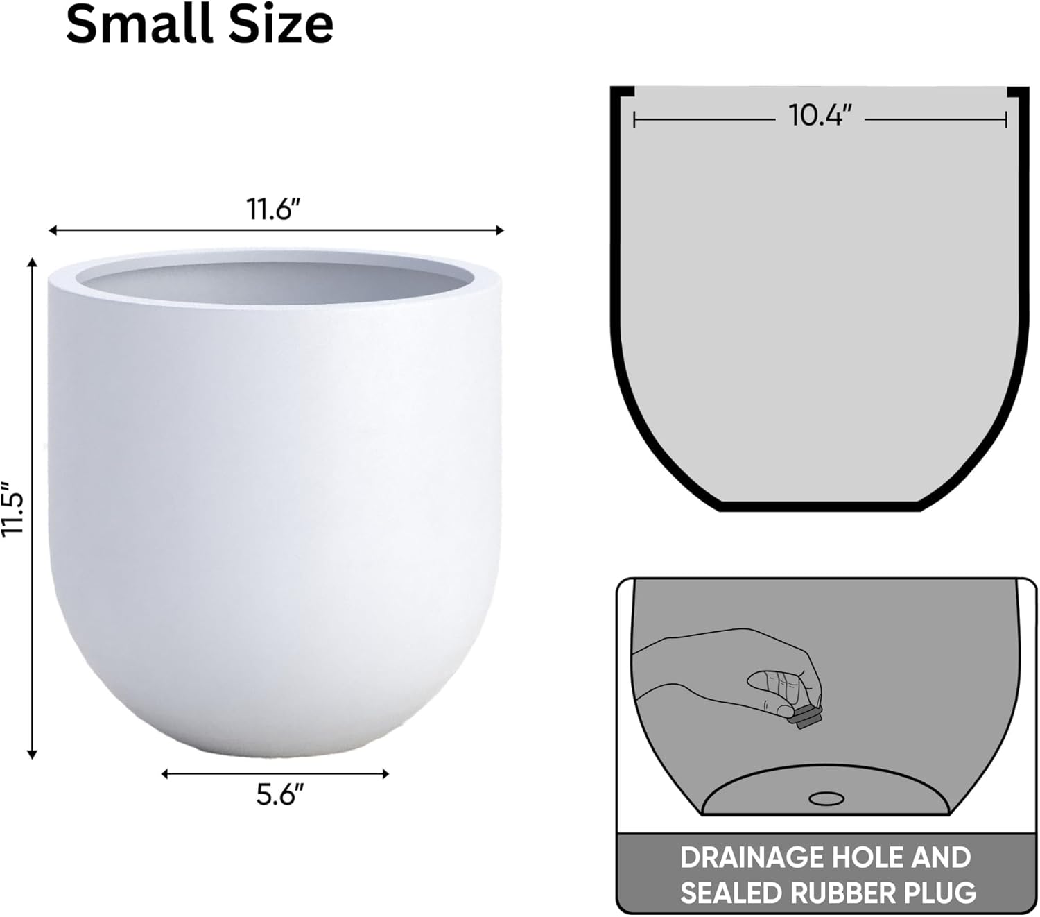 DTY Signature Mount Antero Lightweight and Durable Modern Fiberstone Bullet Shaped Planter Indoor & Outdoor Drainage Hole & Rubber Plug Weather Resistant, 12" H x 12" Dia, 10.2" Opening - Small, White