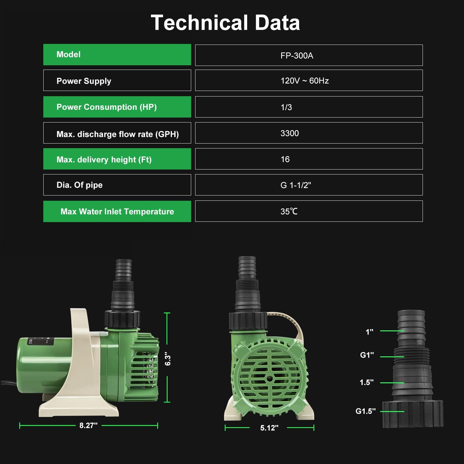Prostormer 1/3HP Submersible Pond Pump, 3300GPH High Flow Water Pump with 16ft Lift Height, Garden Pumps, for Ponds, Fountains, Waterfalls, Hydroponics, Fish Tanks, Indoor & Outdoor Use