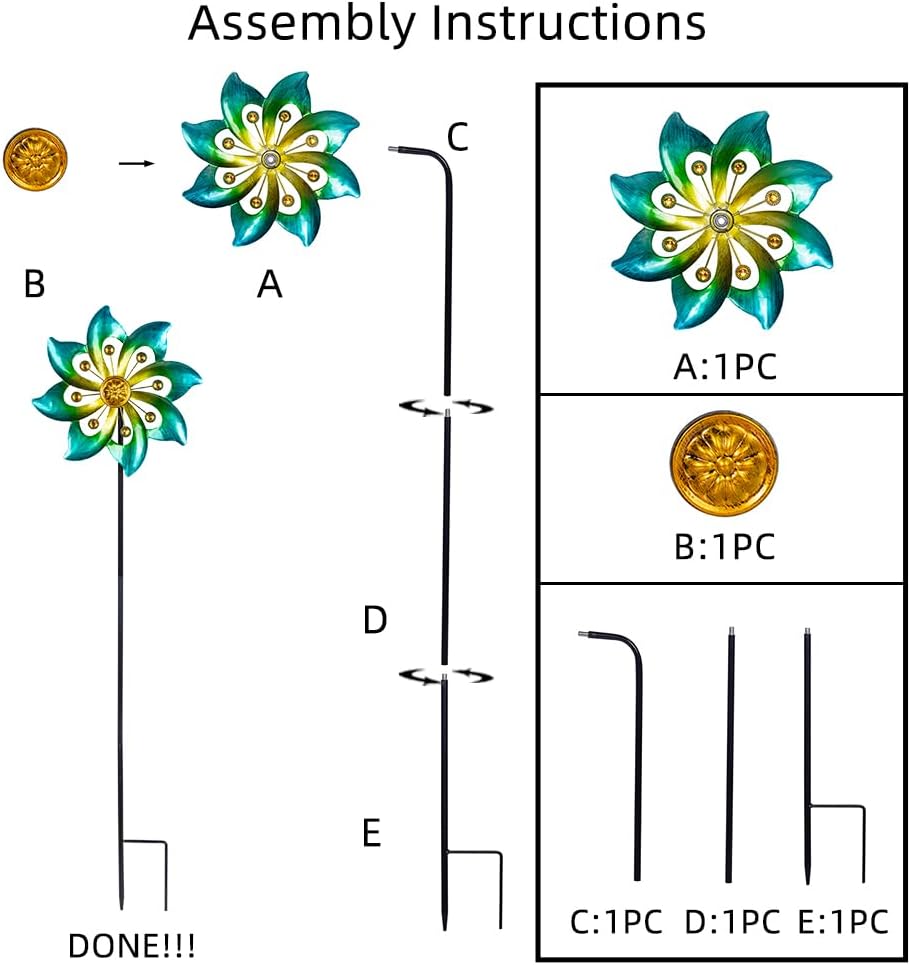 - Installation: Experience hassle-free installation with our garden wind spinners. Simply follow the instructions tighten the screws and enjoy effortless setup in minutes. Our yard spinners's waterproof and fade-resistant properties ensure lasting beauty, even under various weather conditions.
