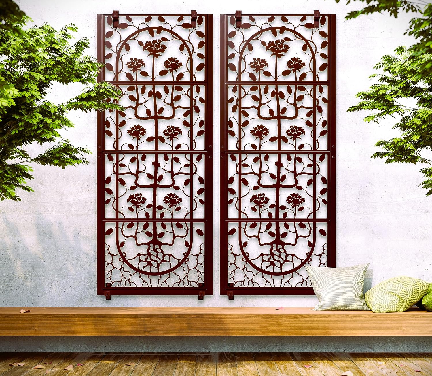 - Tall metal trellis screen with wall brackets as shown - Built from durable materials, the iron frame has a mahogany colored powder coat finish. This patio trellis screen is the perfect new accent piece for your home and garden spaces. Featuring a precision laser cut rose design, complements any greenery or garden design, or stand alone among your outdoor decor. Consider multiples to create a peaceful oasis around the deck or patio.Trellis screen privacy for climbing plants wall art