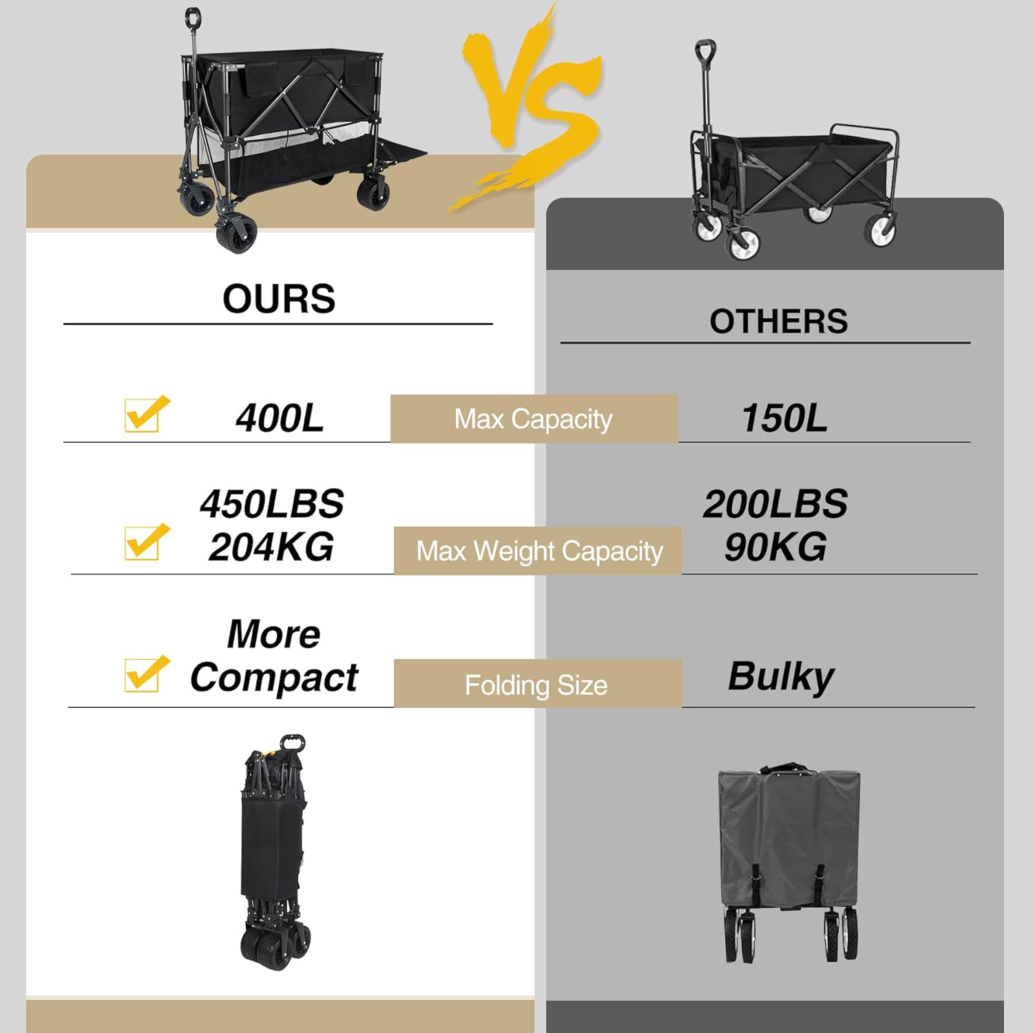 - Compact & Easy to Use: This utility outdoor portable wagon is a round-up style. Equipped with a bottom plate to pack its body, it has a small storage volume. With folded size: 13"Lx9.4"Wx41"H, it can be easily stored in your trunk, garage, or closet, ensuring easy transport.