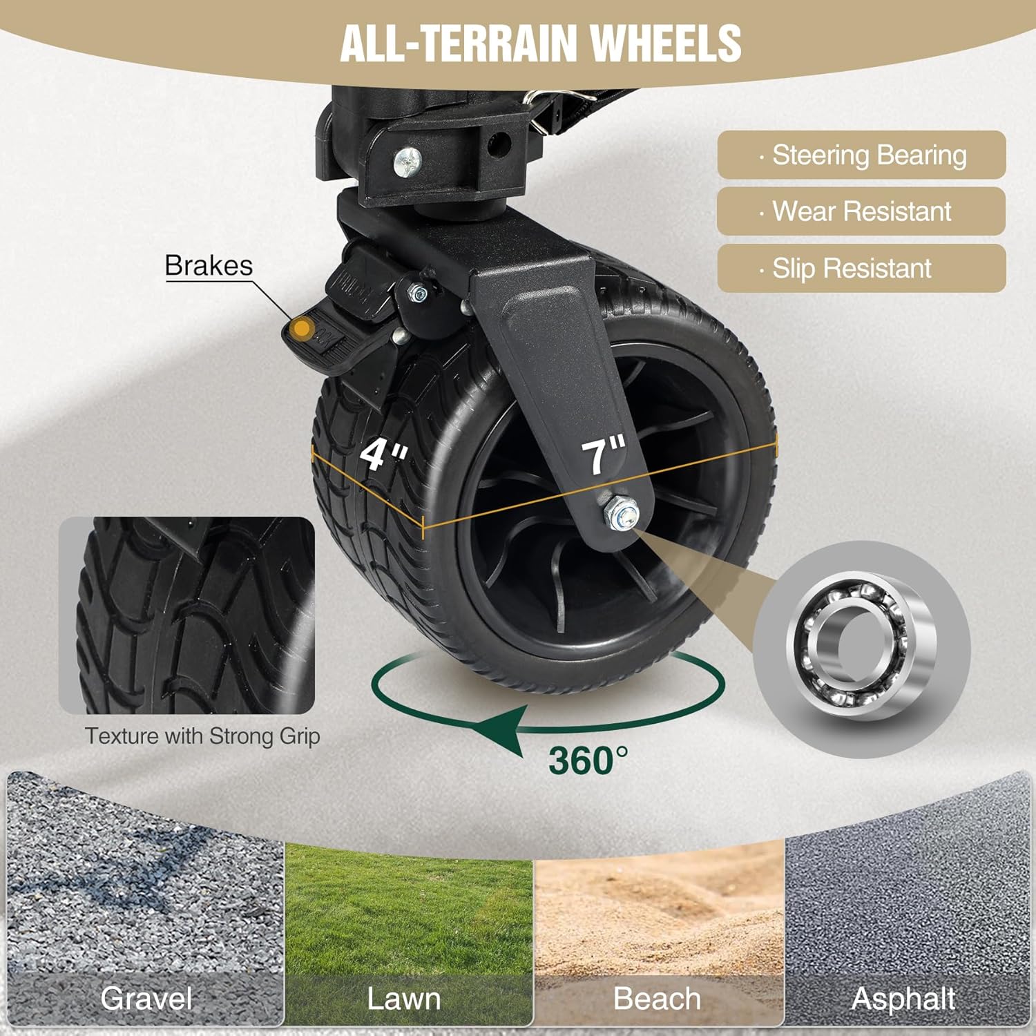 - All-Terrain Wheels: Collapsible beach wagon is equipped with 7" diameter PVC off-road wheels that can move smoothly in any terrain. Among them, the front wheels with brakes can rotate 360 °, making it easy to maneuver and safe to park.