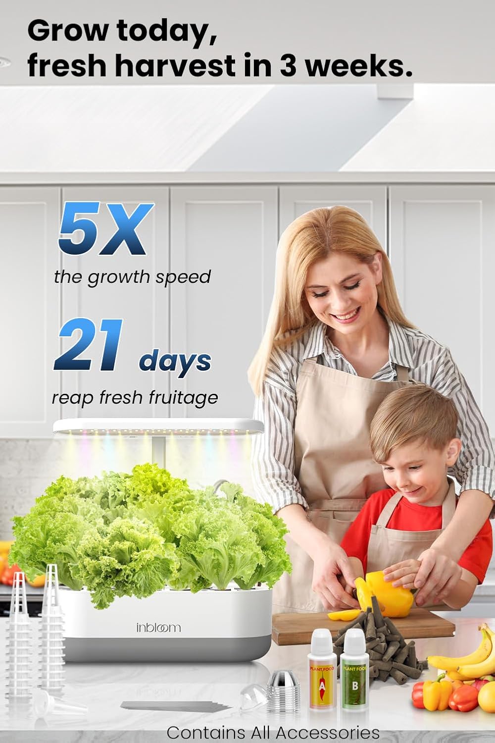 inBloom 12 Pods Hydroponics Growing System Indoor Garden with LED Grow Light and Pod Kit, Plants Germination Kit with 4.2L Water Pump Accelerate, Height Adjustable, Gardening Gifts for Women, White