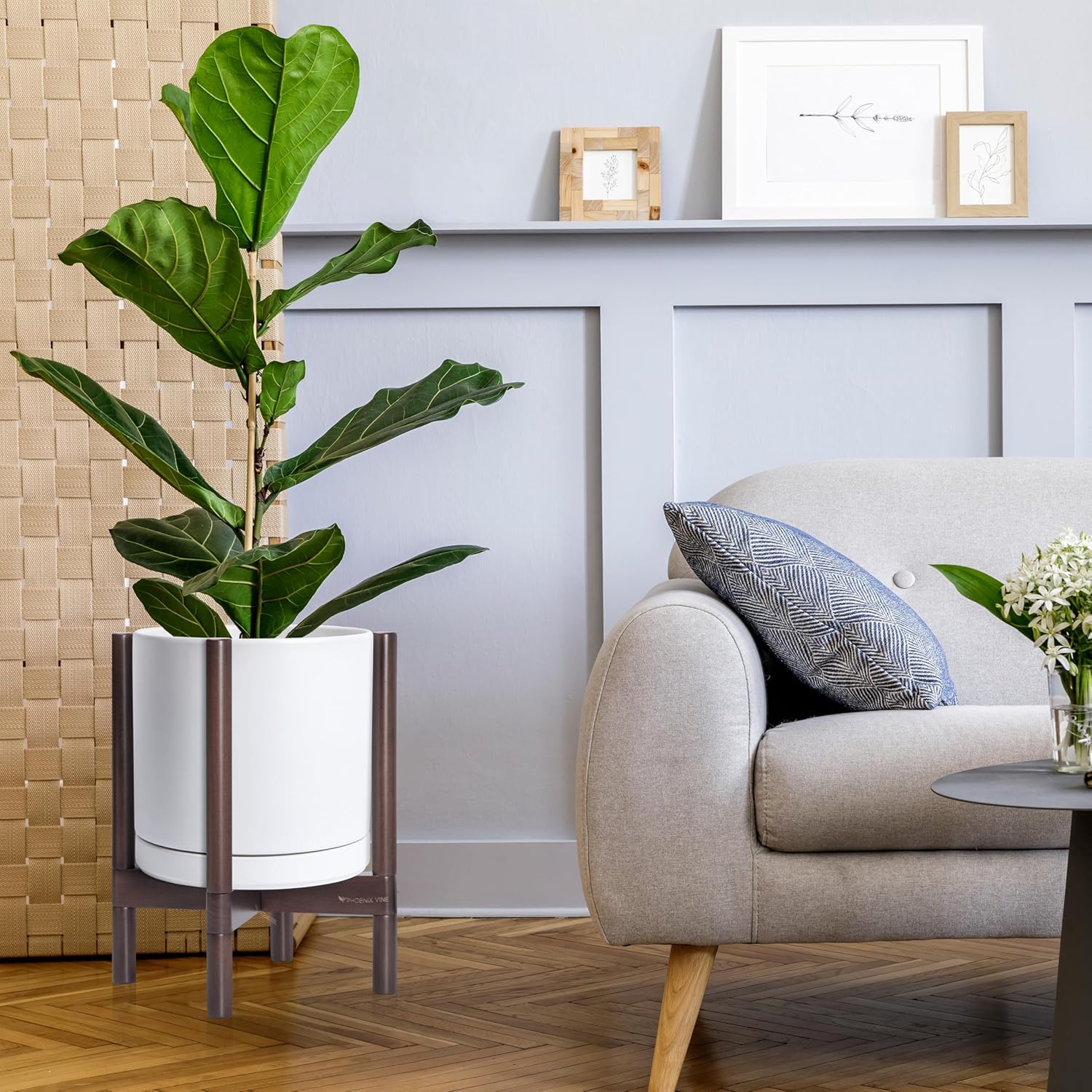 D'vine Dev Ceramic Planter with Walnut Color Stand - 12 Inch Modern Round Flower Pot with Wood Planter Holder, White, 55-B-W-1