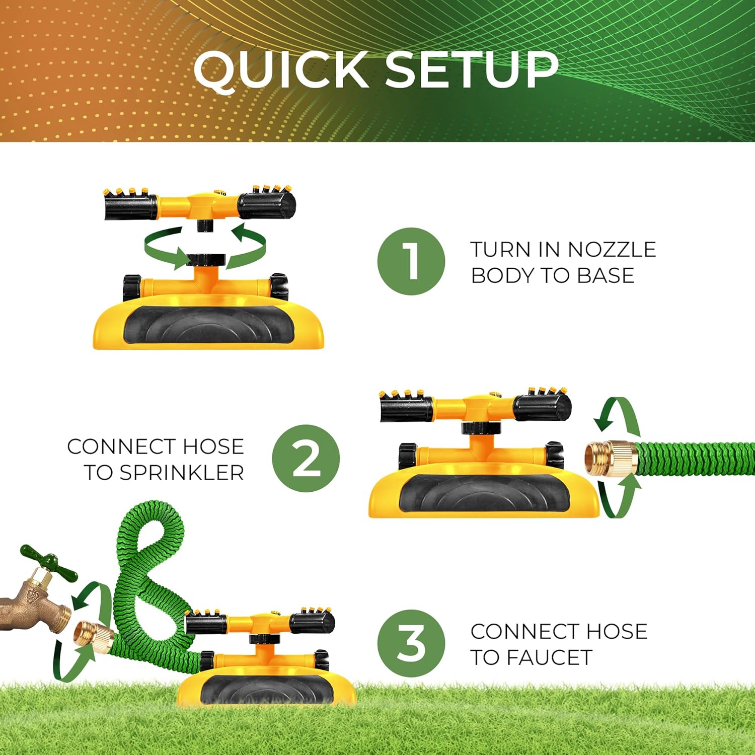 - Easy To Use: Simply attach your garden hose to the lawn sprinkler hose connector and turn on the faucet. As the water pressure increases the rotating arms will begin to spin and provide a rain like irrigation to your lawn!