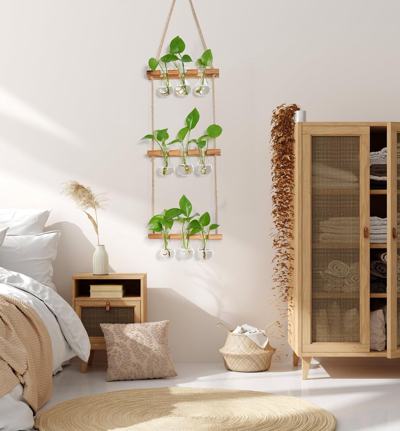 - 【Package includes】Wooden stand*3(Wooden stand installed hemp rope),glass vase*9,traceless nail*2,cleaning brush*1. Small plant stand can be easily assembled.If the products received are unbalanced, adjust the rope to balance.