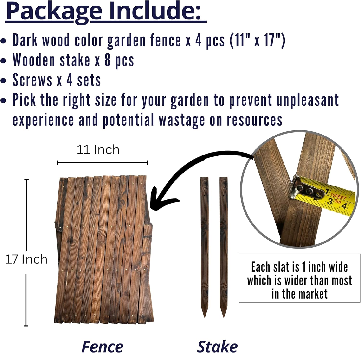 - SIZE DIMENSION: 2 Pack Total 12 ft(L); 4 Pack Total 24 ft(L)- This flexible garden decorative fences can adjust to the length and height according to your special uses. The 2 packs package included Dark Wood color garden fence x 2pcs, wooden stake x 4pcs and Screw x 2sets; 4 packs package included Dark Wood color garden fence x 4pcs, wooden stake x 8pcs and Screw x 4sets.