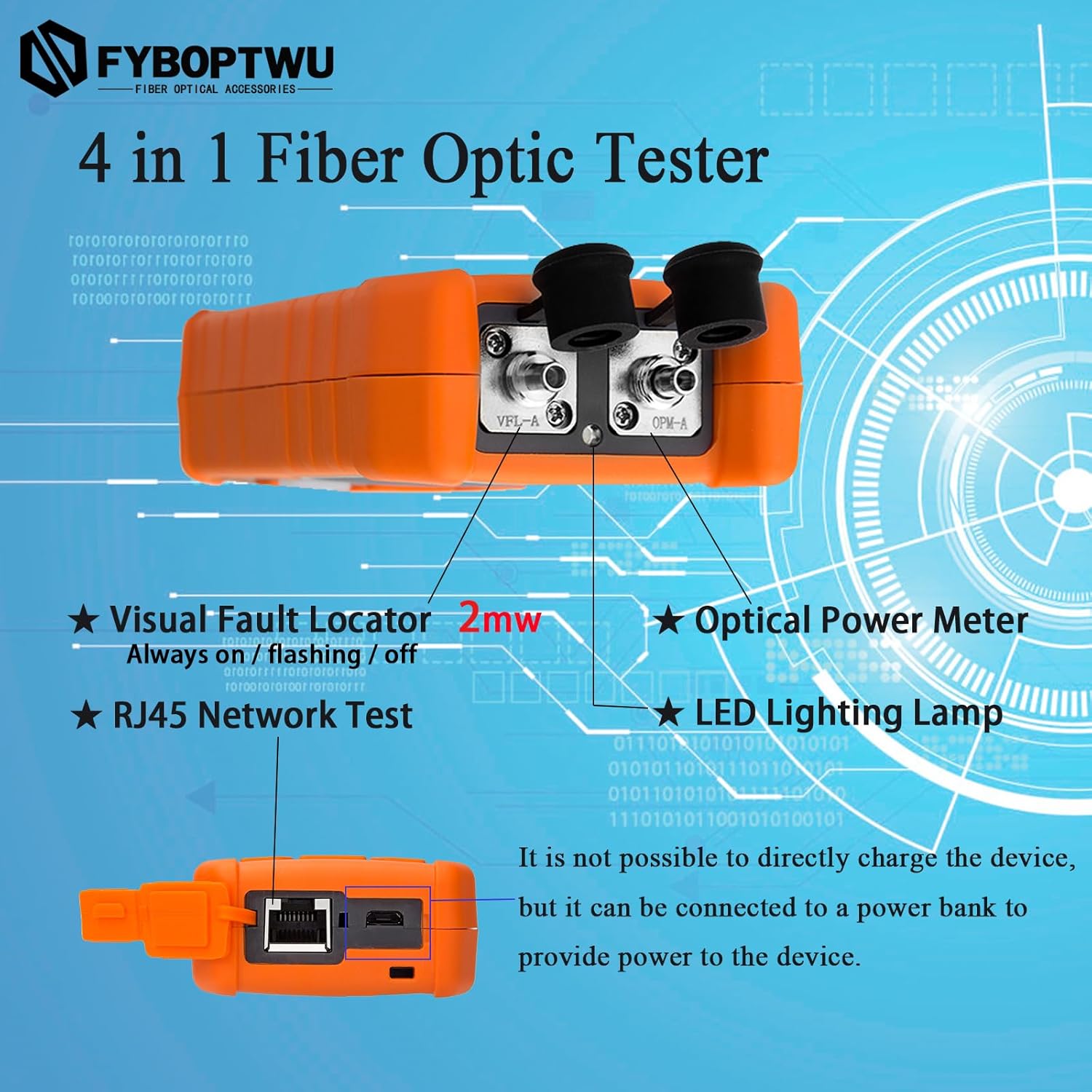 - 【4 in 1 Function】 Optical power meter & 2mw Visual Fault Locator (VFL) & RJ45 Network test & LED Lighting. It Needs 2 x AAA Batteries.(Note: Batteries Not Included in package)