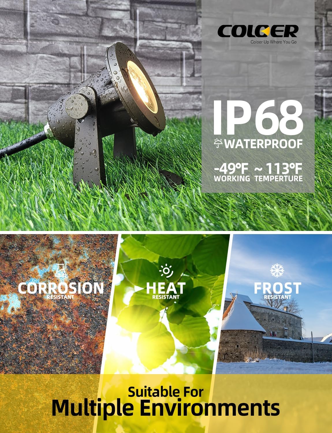 - IP68 Waterproof Fixture: This well-made waterproof underwater light is constructed from die-cast brass. With a rating of IP68 waterproof, this fixture is fully submersible and can be placed fairly deep in your pond floor. The bronze finish allows it to maintain its original appearance even after being underwater for a prolonged period of time. COLOER landscape lighting offers a lifetime warranty on the light fixture(painted finish is 10 years) and a 5 years for the LED bulb.