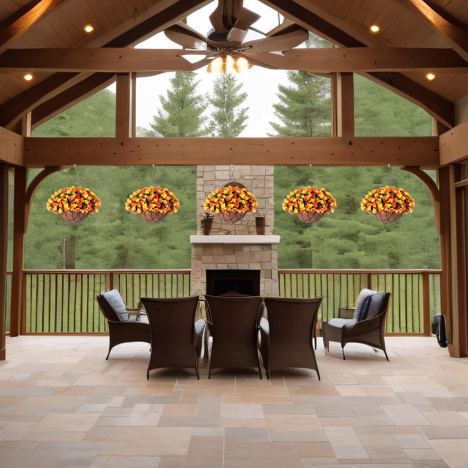 Fall Artificial Hanging Flowers with 12" Basket for Outdoor Decor, Fake Hydrangea UV Resistant Arrangements in Pot Planter Decor for Autumn Porch Garden Yard(OrangeYellow)