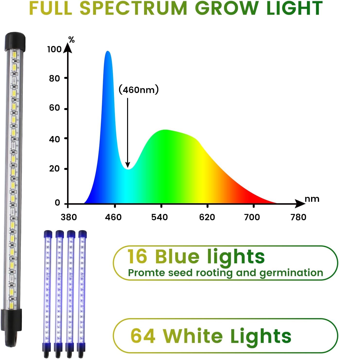- ăFull-Spectrum LED Grow LightăEach seed starter trays has 2 plant grow light; and each grow light is composed of Red + Blue lamp beads, which can simulate natural sunlight to promote photosynthesis and then help seed growing