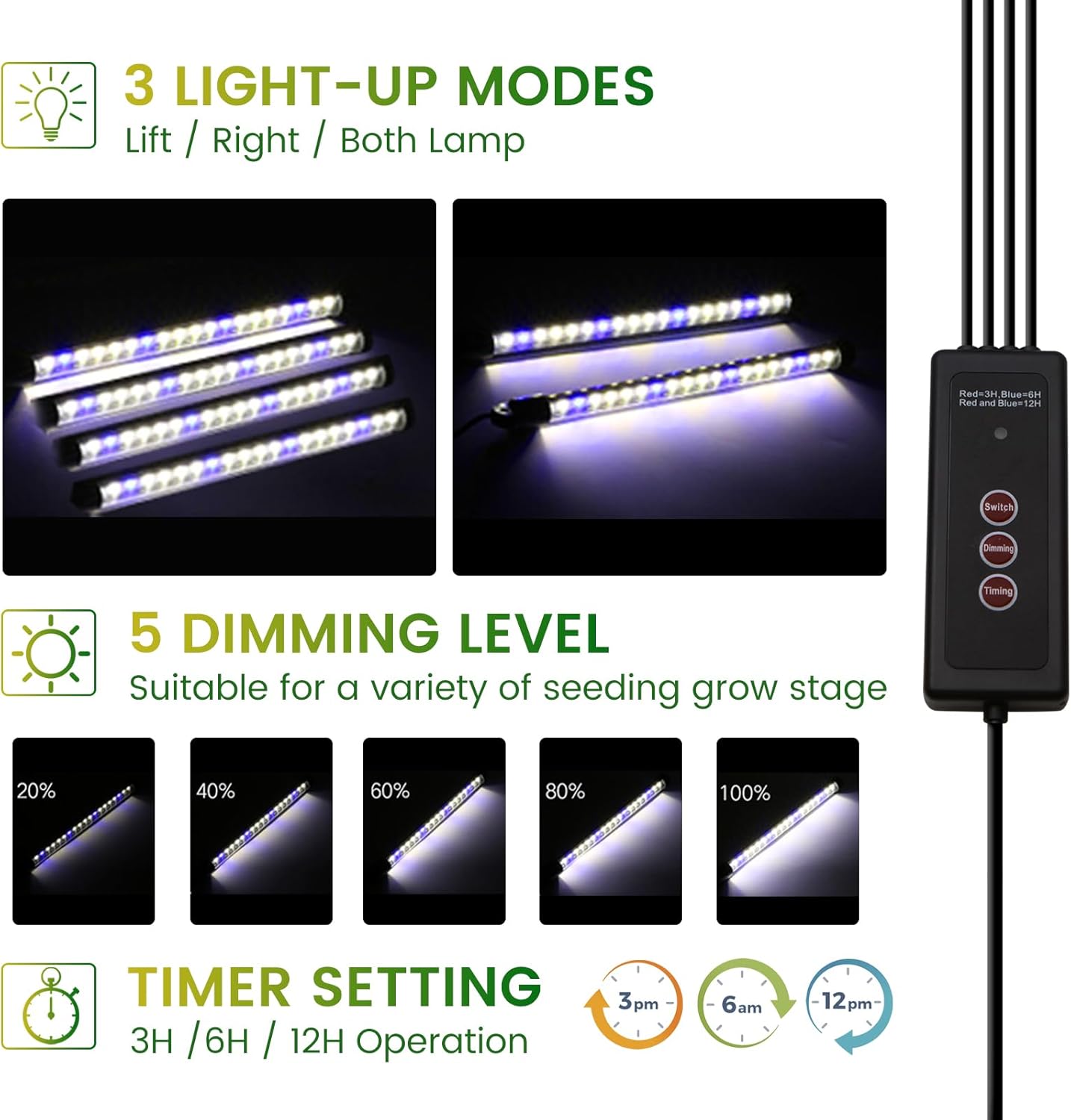 - ă5 Levels Brightness & Timer Settingă Dimmable setting makes seedlings have the right light intensity at different periods of time;level and 3 timing functions (Red 3H/ Blue 6H/ Red+Blue 12H), and it will auto turn on/off at the same time next day