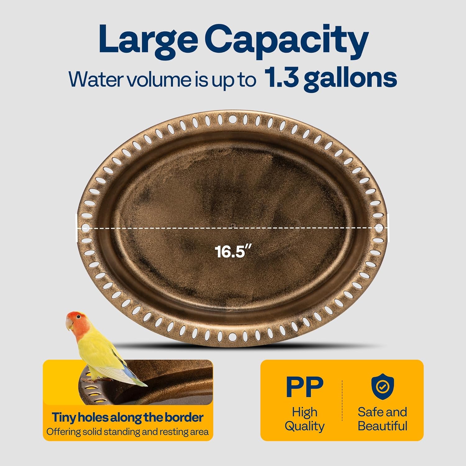- LARGE CAPACITY - This extra-large bird bath features an oval tray with tiny holes along the border, offering a solid standing and resting area for your feathered companions; The bird bath has a capacity of 1.3 gallons and a diameter of 16.5 inches, which will hold enough water or food for your wonderful avians and butterflies to enjoy, and a depth of 3.5 inches is sufficient to accommodate a solar fountain pump or a bird bath deicer (Bowl dimension: 16.5â LĂ12.6â W, bowl depth: 3.5 inches)