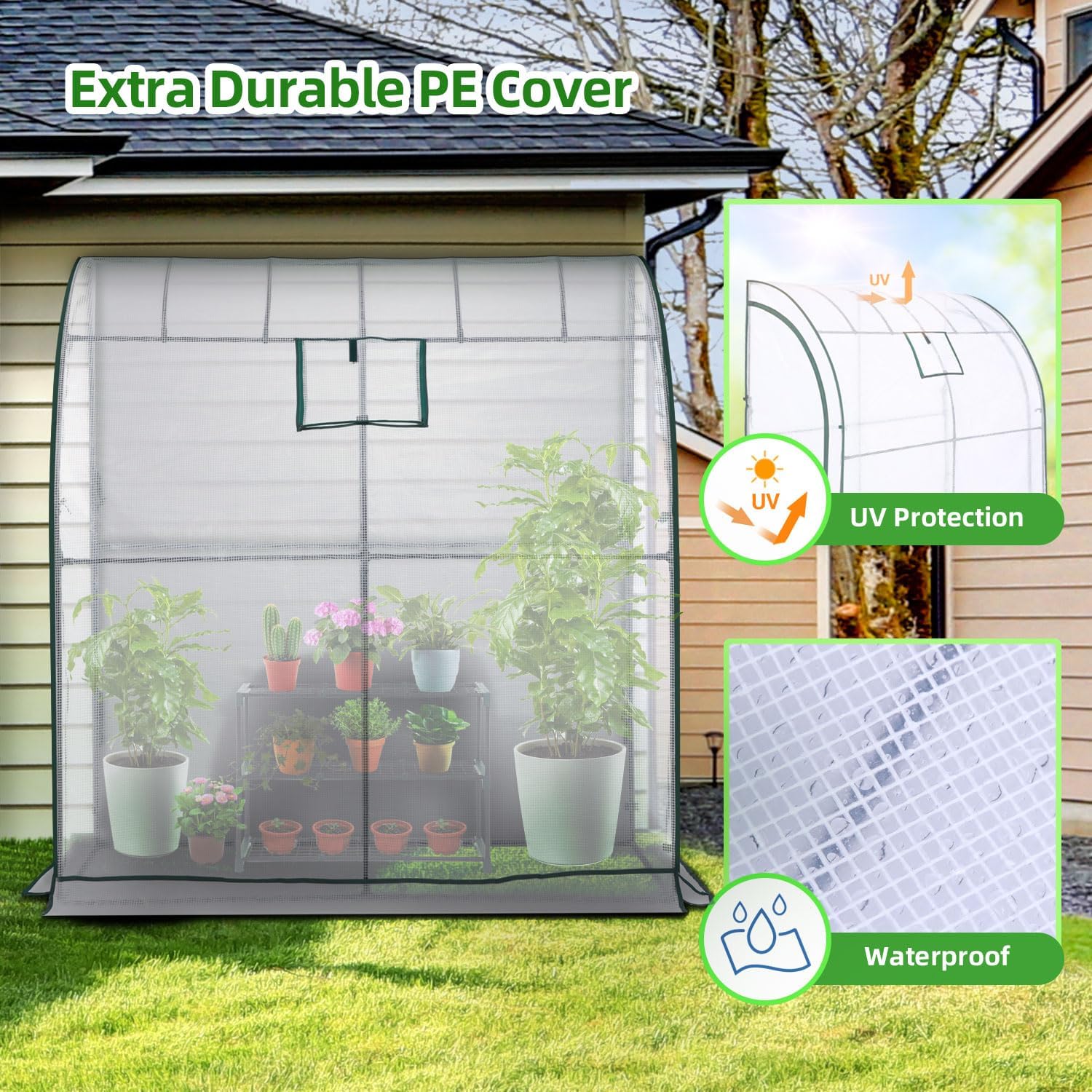 - Reinforced Cover: The greenhouse equipped with a high-quality thick PE cover with double-stitched seams. With UV resistant and waterproof function, it helps maintain high humidity and provides ample light for your plants