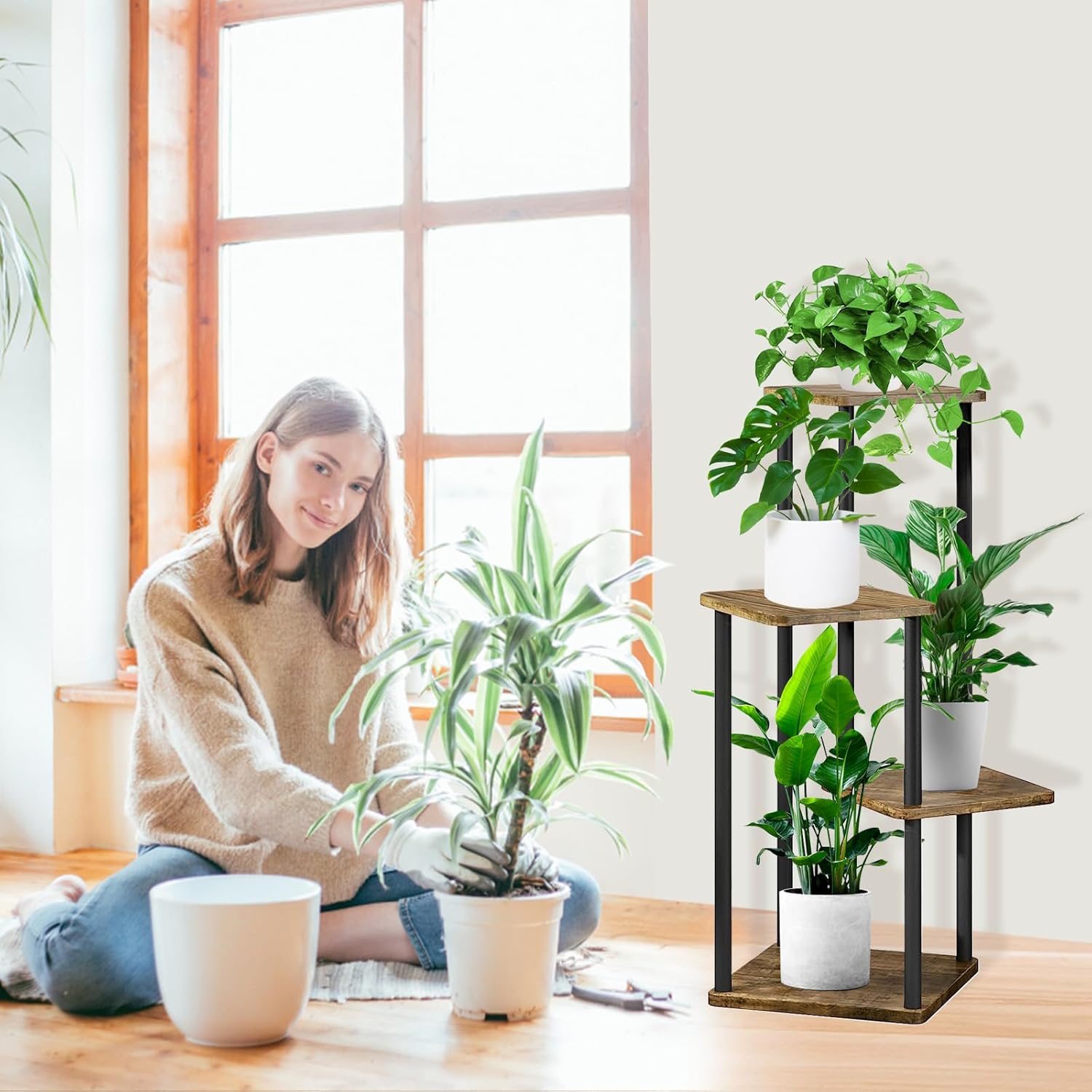 4 Tier Wood Tall Plant Stand Metal Rack Indoor, Multiple Flower Pot Holder Shelves Corner Rack, Planter Shelf Display Rack Storage Organizer for Patio Living Room Balcony Garden(Black)