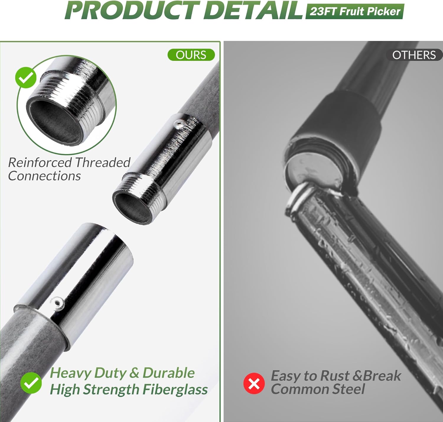 - High-Quality and Durable: Crafted from high-strength fiberglass, our fiberglass poles is robust, safe, and lightweight, making it effortless to use. Additional anti-rotation screws and dual metal rings reinforce the connection between the pole and the fruit net, ensuring durability without bending, breaking, or warping. The 2.2 LBS stainless steel basket is sturdy and resilient, maintaining its shape without deforming or breaking under the weight of the fruit.