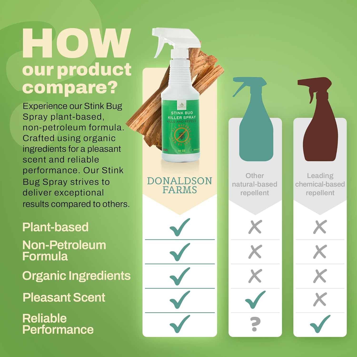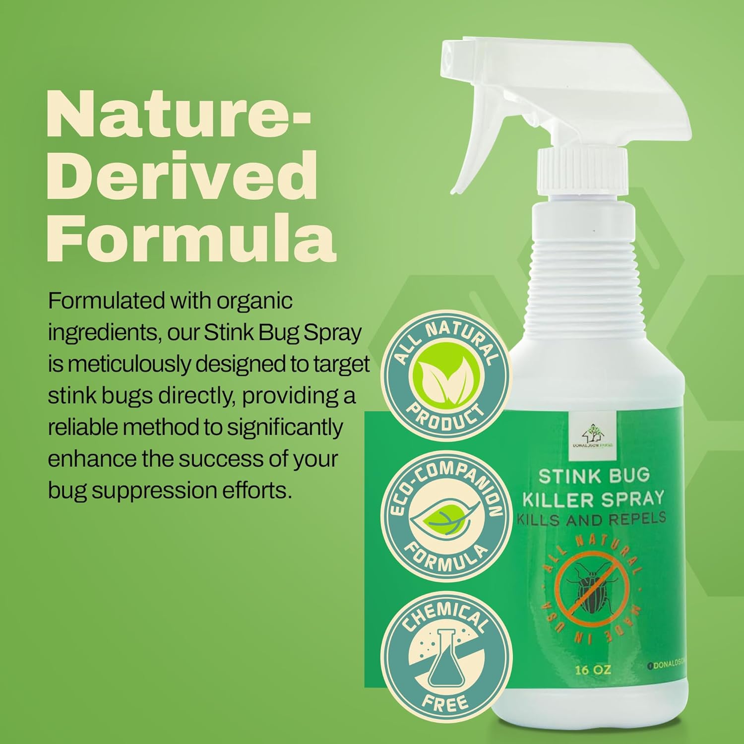 - Peace Of Mind: Our Donaldson Farms Stink Bug Spray is crafted using ingredients that pose no risk. Whether indoors or outdoors, trust its effectiveness without concerns about harmful chemicals.
