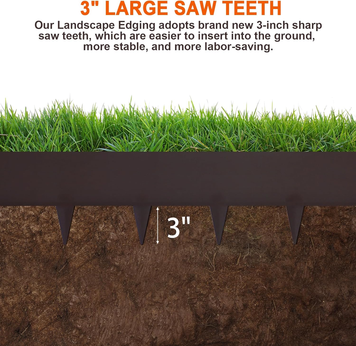 - [3" Large Saw Teeth] - Our Steel Landscape Edging adopts brand new 3-inch sharp saw teeth, the no-dig design, along with the included clips, which are easier to insert into the ground. The 6-inch depth is perfect for keeping mulch and soil in place while preventing grass from encroaching into your flower beds