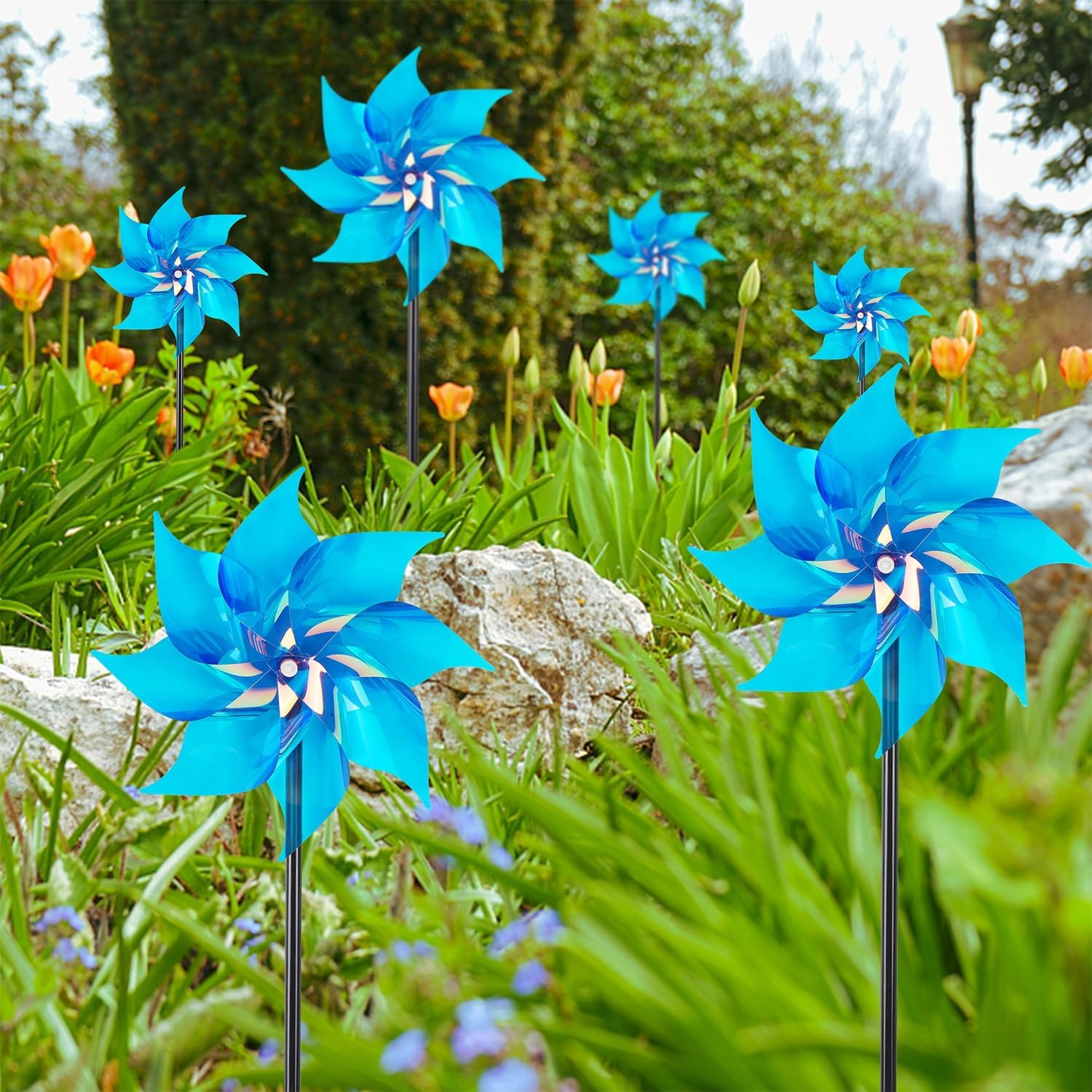 - Garden Decoration: Garden spinner pinwheel is 18.5 inches tall that enough to attract the attention of birds from a distance. They are so beautiful as they spin in the wind and reflect sunlight. These spinners work like any other holographic scare tape or scare rods, but they are also an elegant addition to your garden
