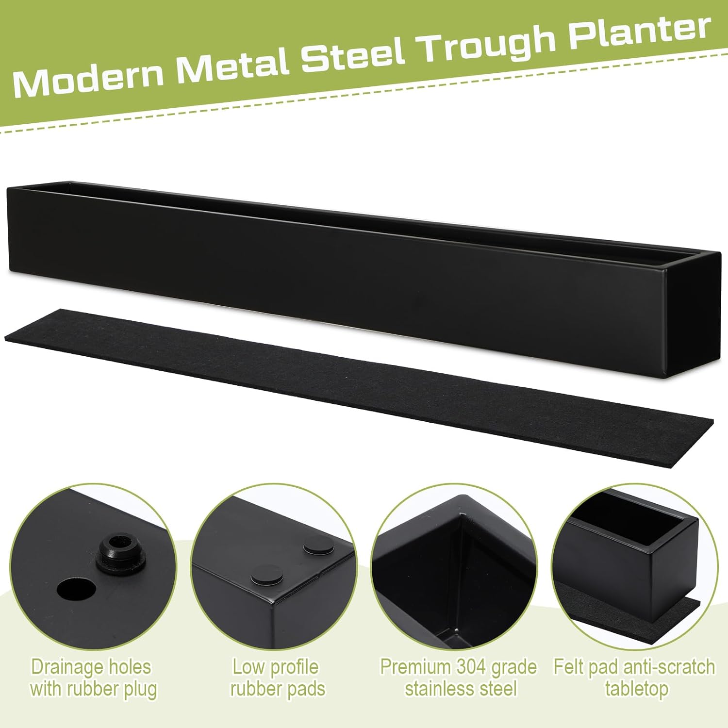 - Metal Planter: each rectangle modern planter comes with four stoppered drainage holes, which you can either plug or drain; The stainless steel flowerpot is lightweight and very strong, comes with 4 rubber feet, as well as a felt mat that you can add to lift it slightly and prevent it from scratching your table, and looks very classy and beautiful