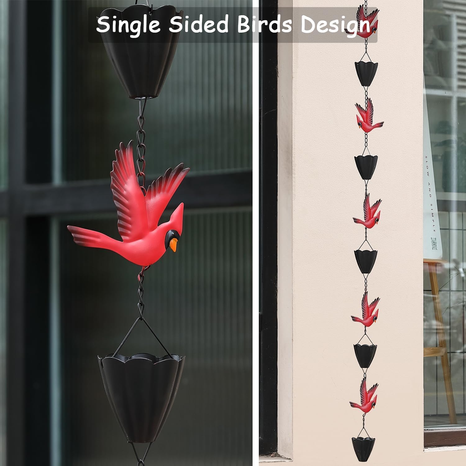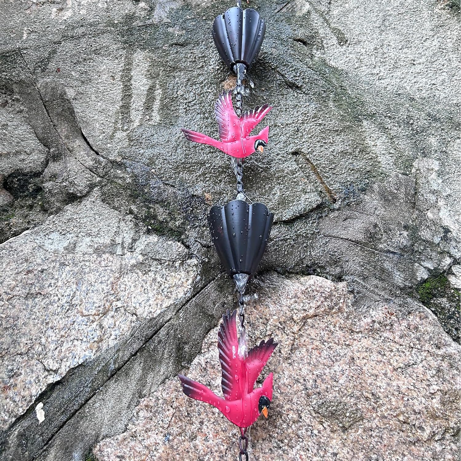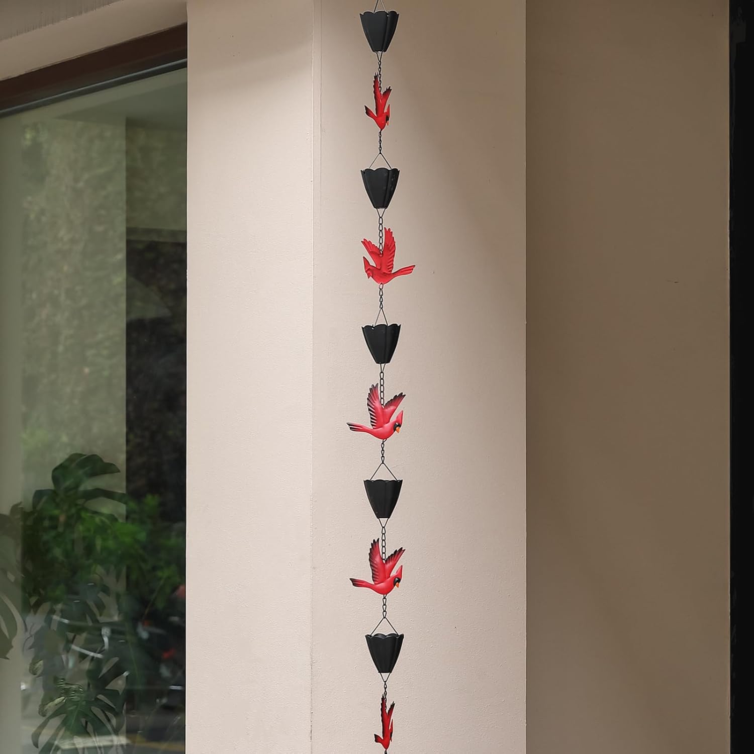 - š¦ Cardinal Rain Chains: This decorative rain chain is uniquely designed and consists of 8 vivid cardinal birds and 9 vintage elegant cups. The edge of bird feathers is black, which makes them look less boring. The collision of black and red adds a touch of mock examination flavor to the whole rain gutter chain.