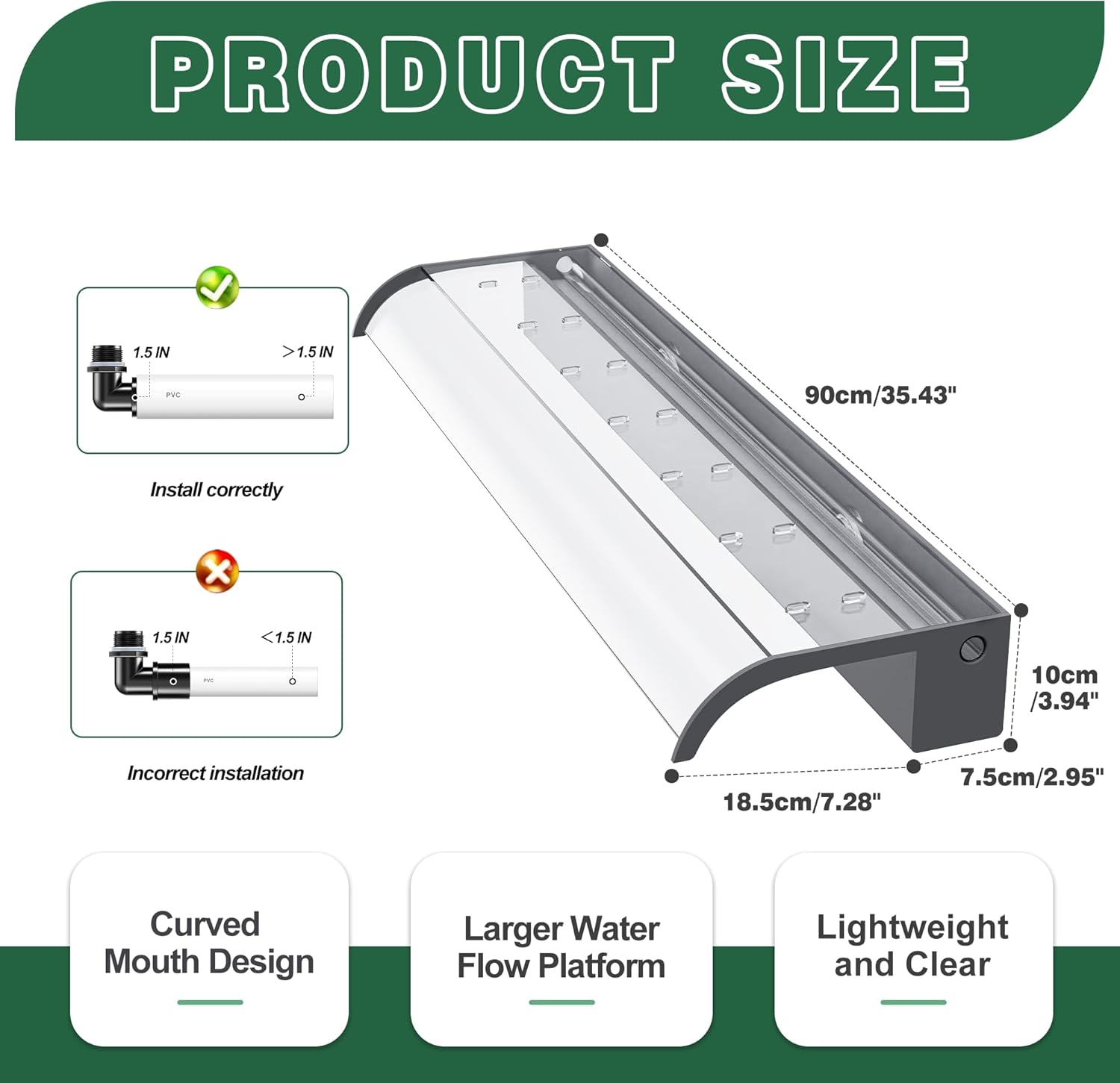 - ăUpdated Curved Open Lipă- Unlike other narrow, short waterfalls, our updated pond waterfall features an integrated 8-inch wide water platform and 4-inch high water storage tank platform, and curved open lip. This wider, longer design creates a stable, smooth stunning water flow, so you can better enjoy the soothing sights and sounds of the cascading water. Waterfall does not include LED lights. Purchase them in our store.